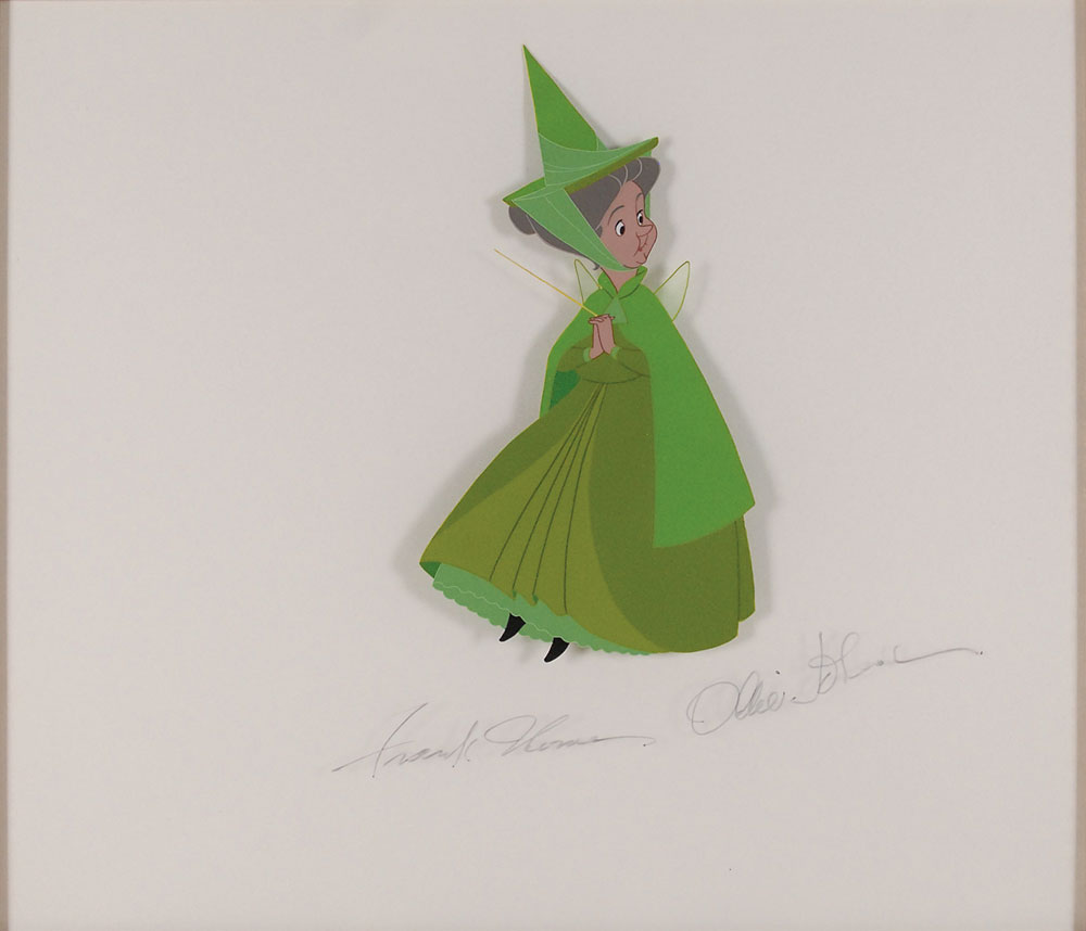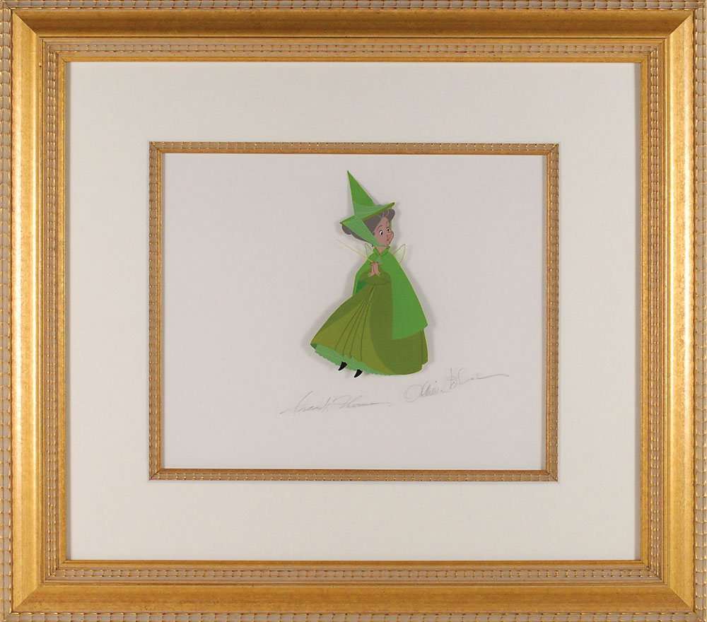 (Walt Disney Studios, 1959) Original production cel featuring Fauna from Sleeping Beauty, showing the fairy in her classic green costume. Signed at the bottom in black felt tip by Frank Thomas and Ollie Johnston. Image measures 4 x 7, with a mat opening of 12.75 x 10.75. This piece is also framed to an overall size of 23.5 x 21.5. In fine condition.
