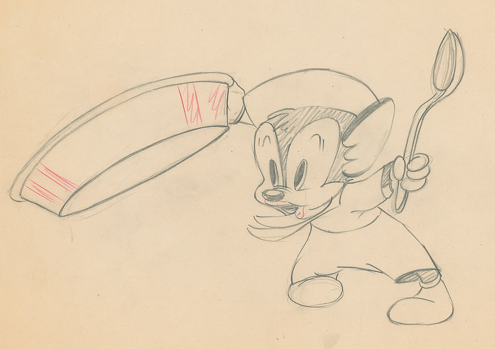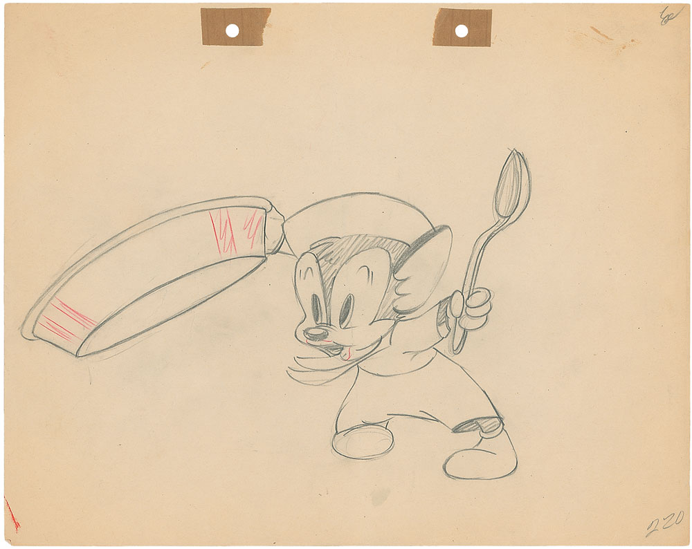 (Warner Brothers Studios, Circa 1940s) Rare original production drawing featuring Sniffles from a 1940s cartoon. Accomplished in graphite on untrimmed 12 x 9.5 animation paper. Image of Sniffles banging on a metal dish with a spoon measures 9 x 6. In fine condition, with a bit of scattered light toning and soiling.