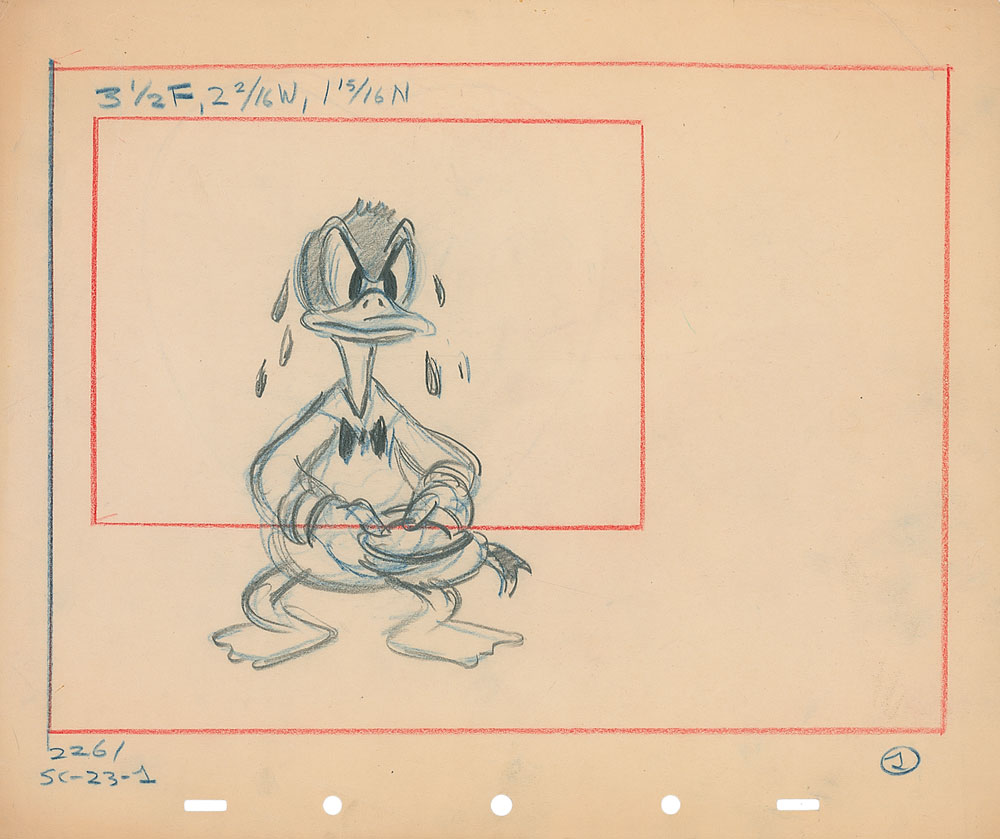 (Walt Disney Studios, 1941) Original production layout drawing featuring Donald Duck from A Good Time for a Dime. Accomplished in colored pencil and graphite on untrimmed 12 x 10 animation paper. Full-length image of a soaked Donald measures 4 x 5.5, with two red squares added during production. In fine condition.