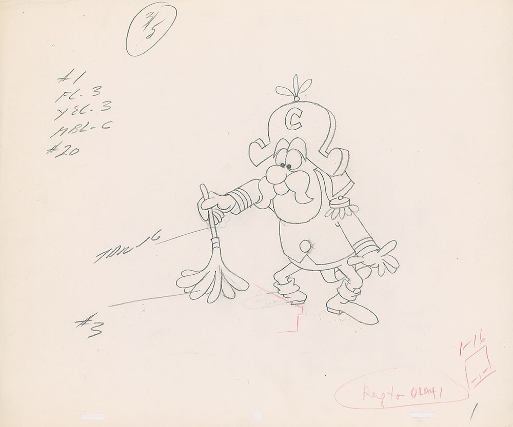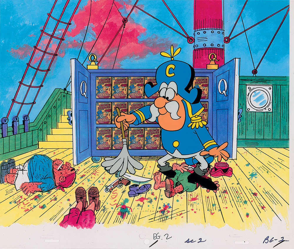 (Jay Ward, Circa 1970s) Original production cel with matching drawings featuring Captain Crunch from Captain Crunch cereal television commercial. The cel is placed on a matching studio copy background. Image of Captain Crunch with a feather duster measures 5.5 x 6.25, with overall dimensions of 14.5 x 11. Also included is the matching graphite production sketch on an untrimmed 12.5 x 10.5 animation sheet. In fine condition.