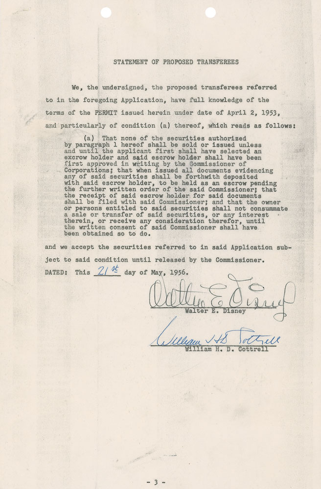 DS, signed “Walter E. Disney,” one page, 8.5 x 13, May 21, 1956. Third page of a document related to the transfer of 150 shares of stock in WED Enterprises. Nicely signed at the conclusion in ballpoint by Disney and countersigned by William H. D. Cottrell. In fine condition, with expected document wear and a diagonal crease to the left side. Accompanied by photocopies of the first two pages of the document. The primary business of WED Enterprises was in overseeing the construction and operations of Disneyland. Cottrell was Walt Disney’s brother-in-law and worked on films such as Alice in Wonderland, Pinocchio, and Peter Pan. This document dates to within a year of Disneyland’s opening, which occurred on July 17, 1955. A wonderful family association related to the famous theme park. Pre-certified Phil Sears.