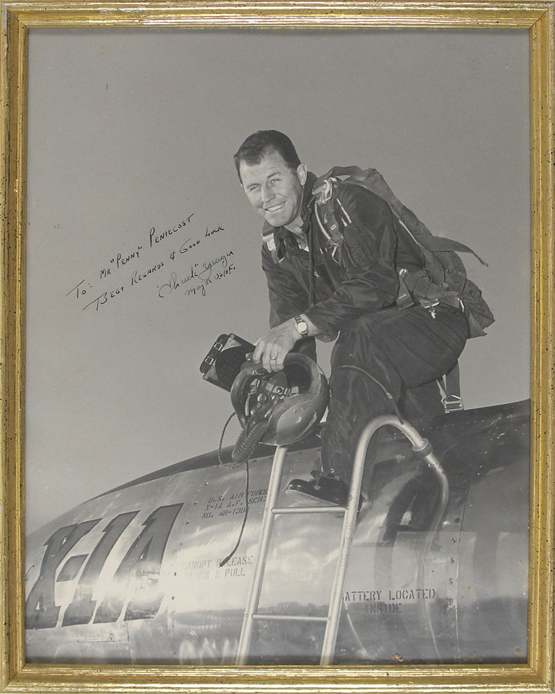 Vintage 10.75 x 14 oversized photo of Yeager exiting the cockpit of his X-1A aircraft, signed and inscribed in fountain pen, “To: Mr. ‘Penny’ Peniecost, Best regards & Good Luck, ‘Chuck’ Yeager, Major U.S.A.F.” Framed to an overall size of 11.75 x 15. In fine condition. Arguably the best Yeager photo we have ever seen, impressive in both size and quality. Pre-certified PSA/DNA and RR Auction COA.