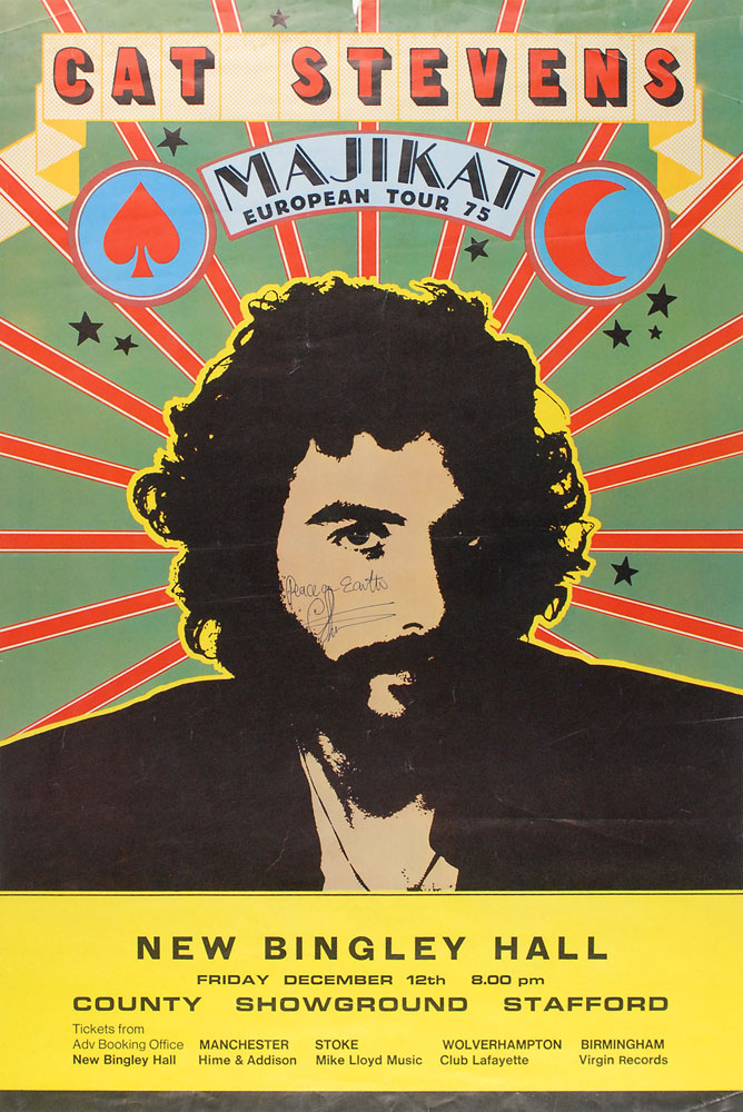 Vintage color 20 x 30 poster for his December 12, 1975, concert tour stop at New Bingley Hall, signed in blue ballpoint, “Peace on Earth, Cat Stevens.” Rolled and in very good condition, with scattered creases, edge dings, and a small tear to top edge. Pre-certified Roger Epperson/REAL and RR Auction COA.