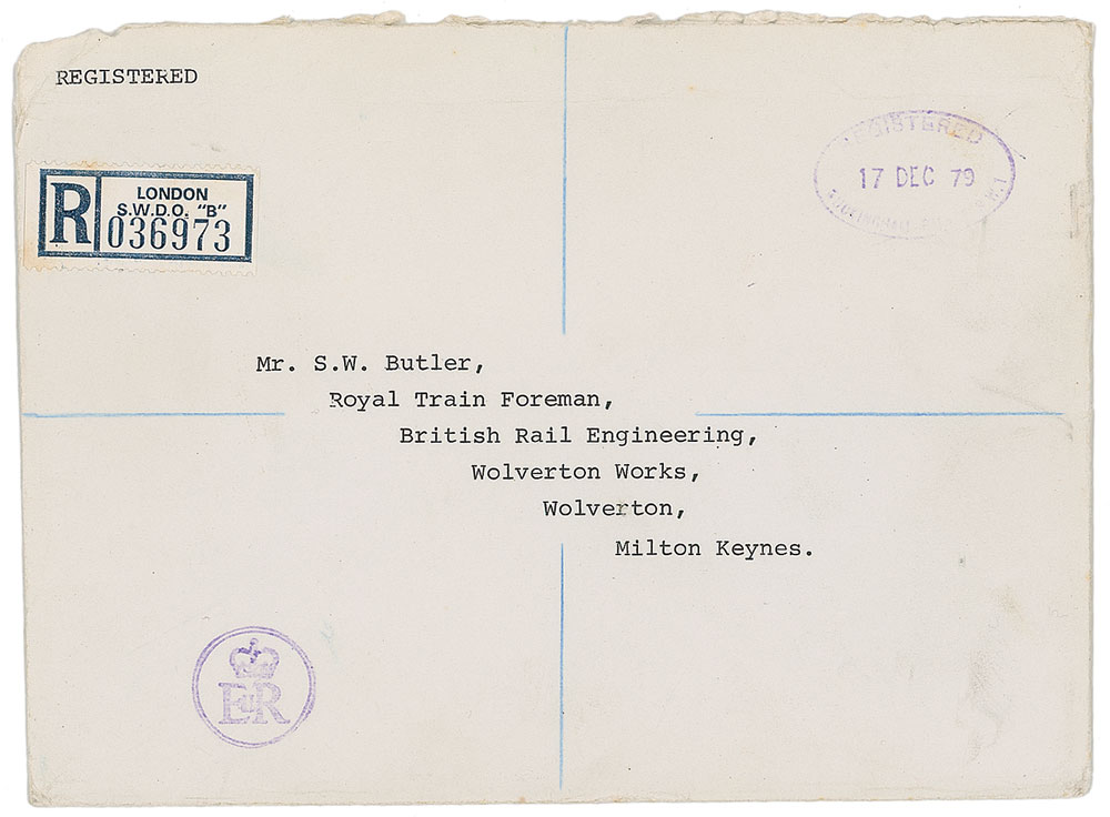 Christmas card from 1979, bearing an embossed coat of arms on the front, measuring 7.25 x 4.75 closed, featuring an affixed color photo inside of Prince Charles and the Queen Mother in an open-top buggy, signed and inscribed on the left side in fountain pen, “Mr. Butler, from Charles.” The left side also bears the printed message, “With all Good Wishes for Christmas and the New Year.” In fine condition. Accompanied by the original mailing envelope. Pre-certified PSA/DNA and RR Auction COA.