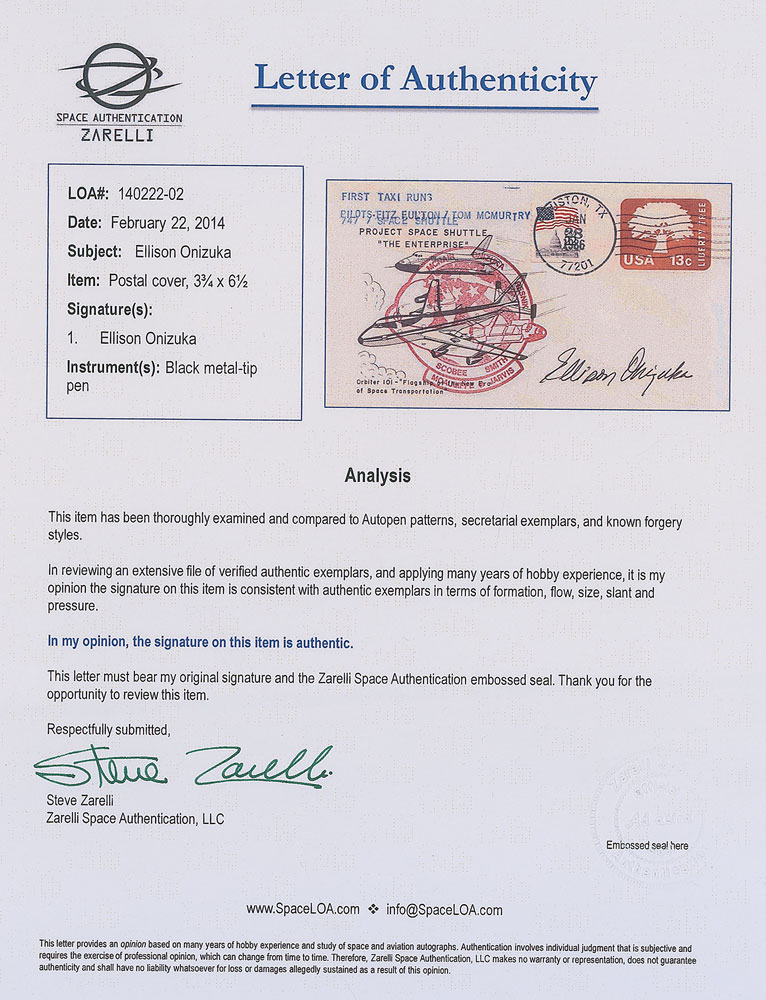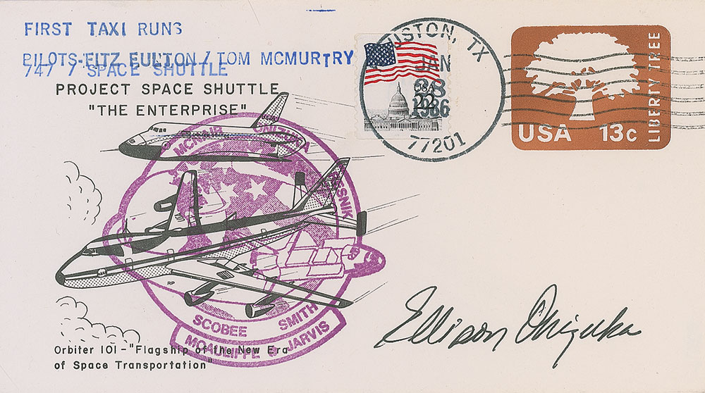 Commemorative cover with a cachet honoring the shuttle Enterprise’s first taxi run, with a Challenger STS-51L cachet stamped over the cover’s printed cachet, signed in black ink by Onizuka. Cover bears a January 28, 1986, cancellation date—the day of the tragic Challenger launch. In fine condition. Accompanied by a full letter of authenticity from Steve Zarelli. RR Auction COA.