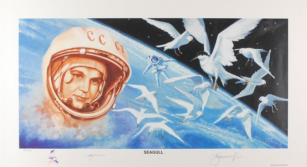 Color limited edition 32 x 17.75 print entitled ‘Seagull,’ numbered #AP 27/95, signed in the lower border in pencil by Leonov and Tereshkova. Rolled and in fine condition. This particular image not only commemorates Tereshkova’s flight, but the 11 seagulls represent the number of American women that had been in space at the time the original was painted. ‘Seagull’ was Tereshkova’s chosen call sign during her mission. Pre-certified Steve Zarelli and RR Auction COA.