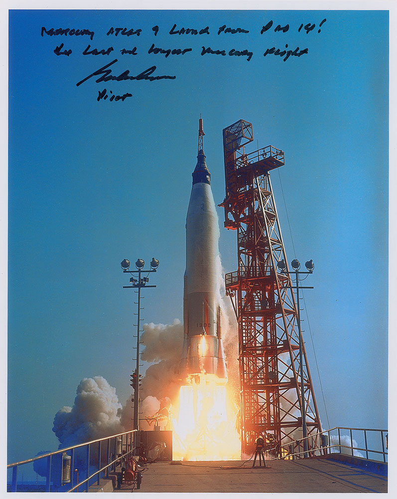 Color satin-finish 8 x 10 photo of the launch of Cooper’s Faith 7 flight, signed in black felt tip, “Mercury Atlas 9 launch from Pad 14! The last and longest Mercury flight, Gordon Cooper, Pilot.” In very fine condition. Pre-certified Steve Zarelli and RR Auction COA.