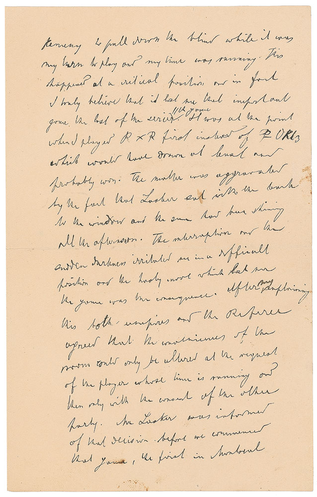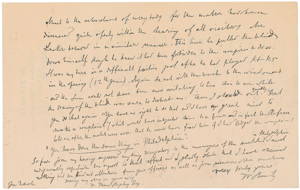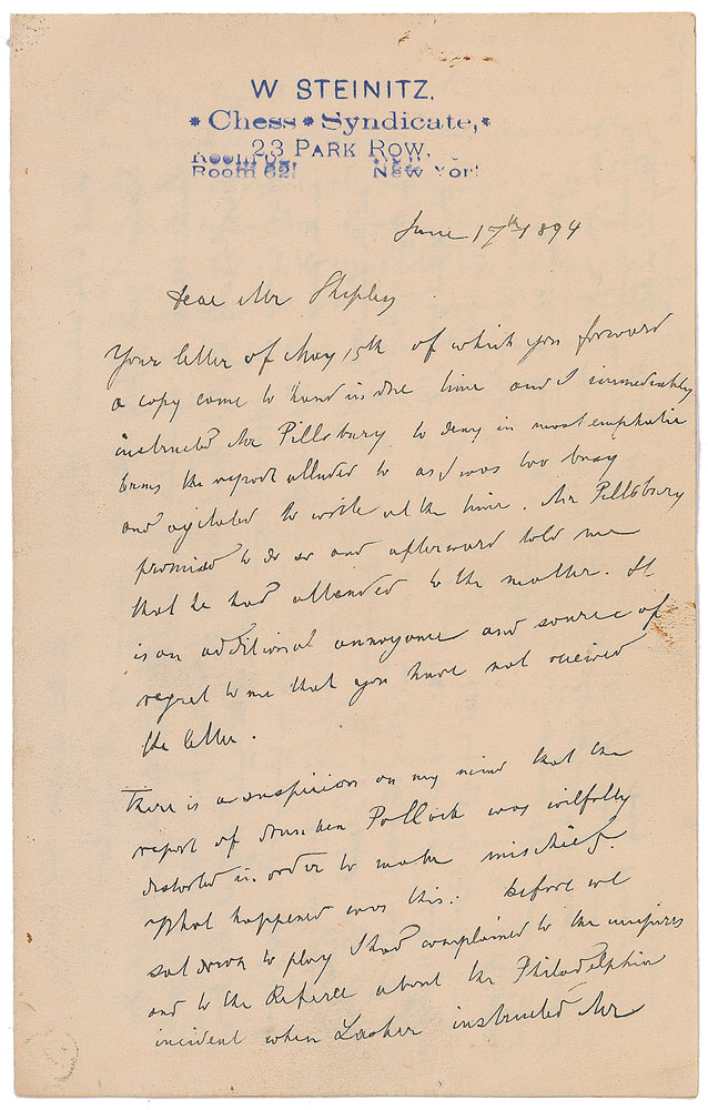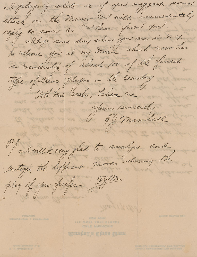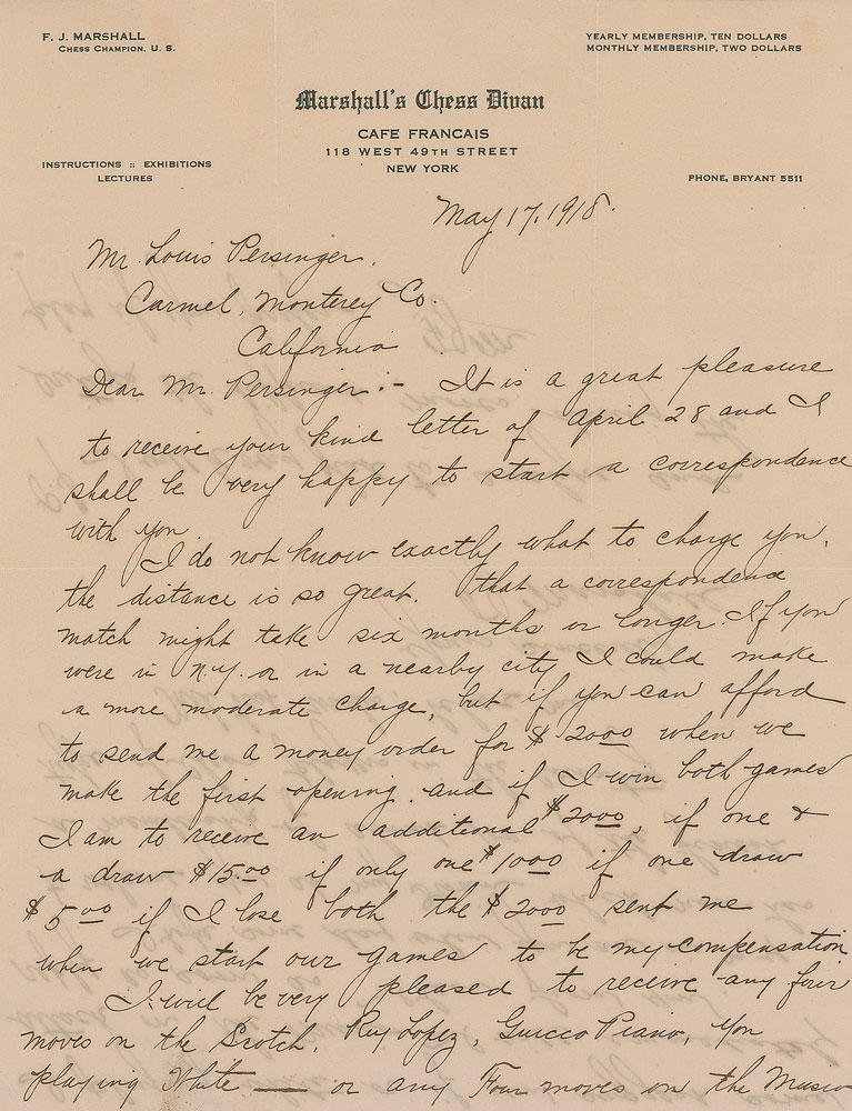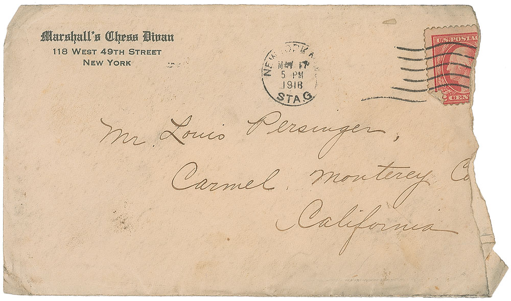 Both chess champions. Steinitz (1836–1900) was the first undisputed world chess champion from 1886 to 1894; Marshall (1877–1944) was the US chess champion from 1909 to 1936. Two ALSs: first is an ALS signed “W. Steinitz,” three pages on two adjoining sheets, June 17, 1894, in part: “There is a suspicion in my mind that the report of…Pollock was willfully distorted in order to make mischief. What happened was this: before we set down to play I had complained to the umpires and to the referee about the Philadelphia incident when Lasker instructed Mr. Kemeny to pull down the blind while it was my turn to play and my time was running. This happened at a critical position and in fact I truly believe it lost me that important game”; and an ALS signed “F. J. Marshall,” one page both sides, May 17, 1918, in part: “The distance is so great that a correspondence match might take six months or longer…If you can afford to send me a money order for $20.00 when we make the first opening, and if I win both games I am to receive an additional $20.00…I will be very glad to analyze and criticize the different moves during the play if you prefer.” In overall fine condition. The Marshall letter is accompanied by the original mailing envelope. Originates from the collection of American violinist and pianist Louis Persinger (1887–1966), who trained at the Leipzig Conservatory and later taught at Juilliard, mentoring the likes of Yehudi Menuhin, Ruggiero Ricci, and Isaac Stern. RR Auction COA.