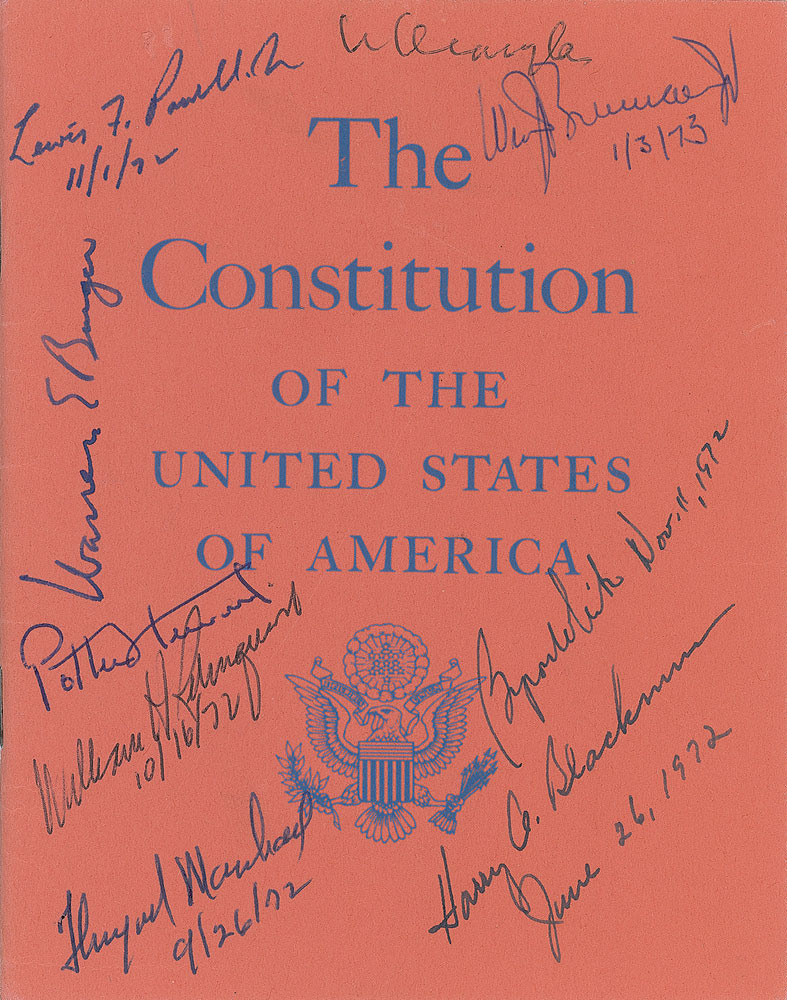 Souvenir booklet containing the text of the United States Constitution, published in 1968 by the US Government Printing Office, 4.5 x 5.75, 30 pages, signed on the front cover in ink by all nine members of the Burger Court, including: Warren E. Burger, William O. Douglas, William J. Brennan, Jr., Potter Stewart, Byron White, Thurgood Marshall, Harry Blackmun, Lewis F. Powell, Jr., and William Rehnquist, many adding the date. In fine condition. Pieces fully signed by the justices of the Supreme Court are scarce. Pre-certified PSA/DNA and RR Auction COA.