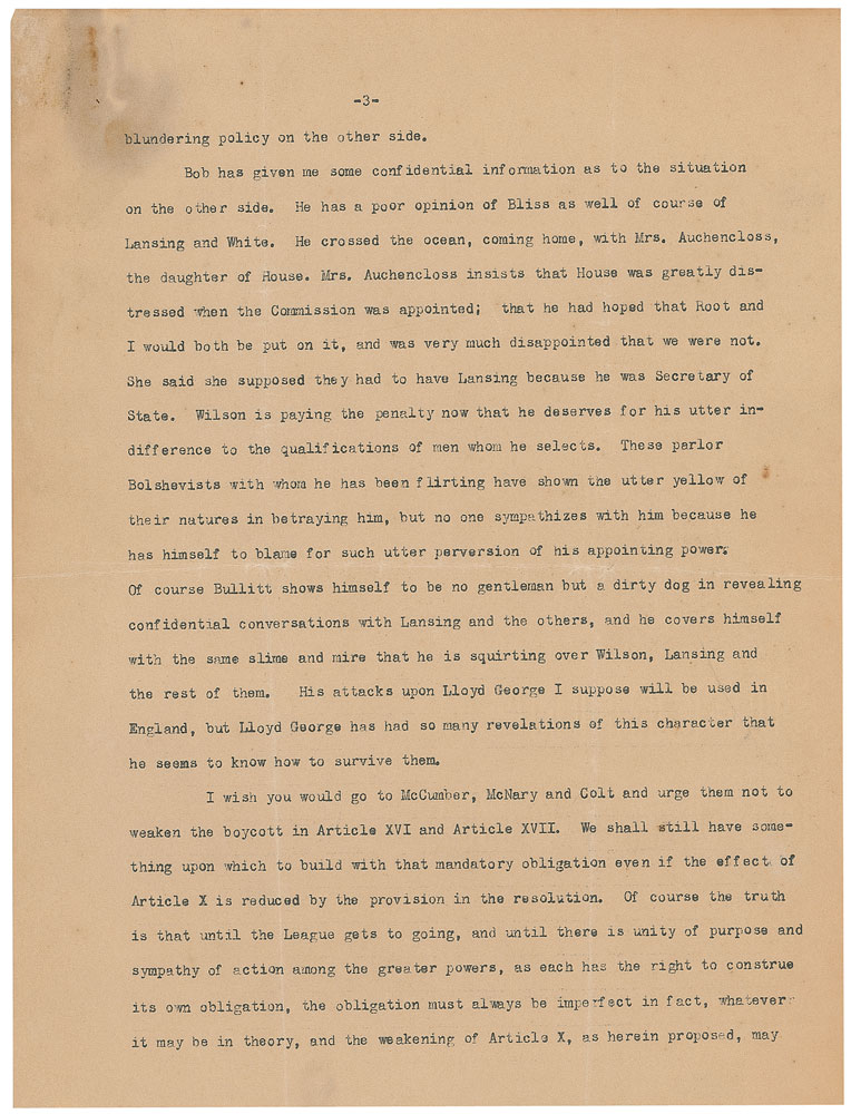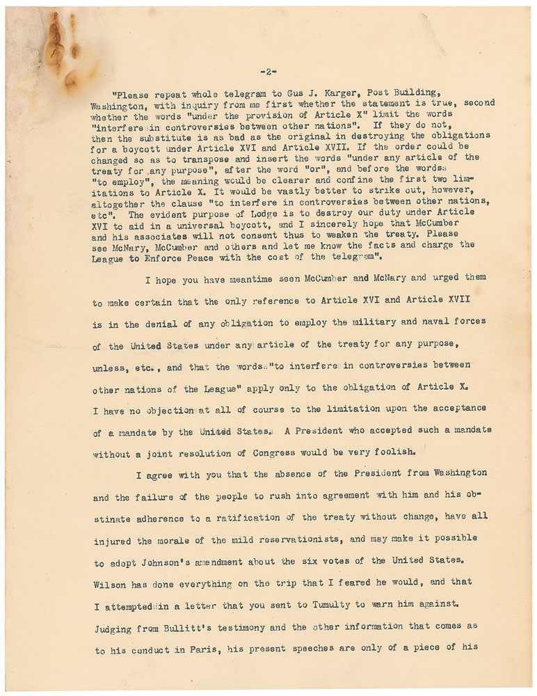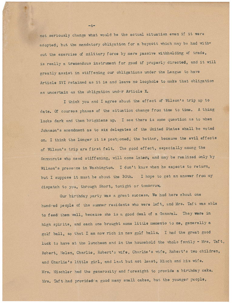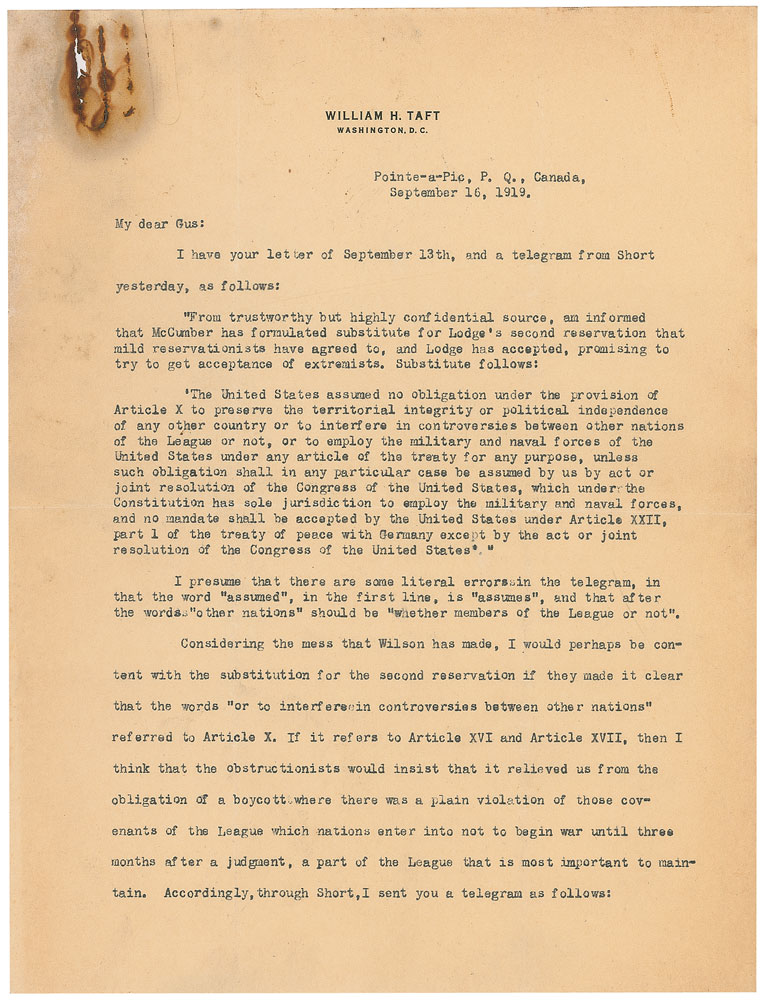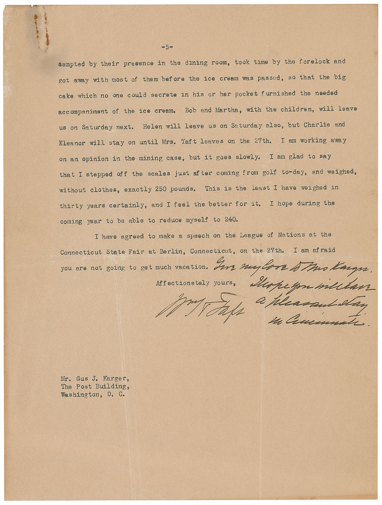 TLS signed “Wm. H. Taft,” five pages, 8 x 10.5, personal Washington, DC, letterhead, September 16, 1919. Letter to Gus J. Karger. In part: “Considering the mess that Wilson has made, I would perhaps be content with the substitution for the second reservation if they made it clear that the words 'or to interfere in controversies between other nations' referred to Article X…the obstructionists would insist that it relieved us from the obligation of a boycott where there was a plain violation of those covenants of the League which nations enter into not to begin war until three months after a judgment…I have no objection at all of course to the limitation upon the acceptance of a mandate by the United States. A President who accepted such a mandate without a joint resolution of Congress would be very foolish…Wilson is paying the penalty now that he deserves for his utter indifference to the qualifications of men whom he selects. These parlor Bolshevists with whom he has been flirting have shown the utter yellow of their natures in betraying him, but no one sympathizes with him because he has himself to blame for such utter perversion of his appointing powers…I am glad to say that I stepped off the scales just after coming from golf to-day, and weighed, without clothes, exactly 250 pounds. This is the least I have weighed in thirty years certainly, and I feel the better for it. I hope during the coming year I might be able to reduce myself to 240." Taft adds a brief handwritten postscript, "Give my love to Mrs. Karger. I hope you will have a pleasant stay in Cincinnati." In very good condition, with intersecting folds and rusty paperclip marks and a bit of dampstaining to the upper left.