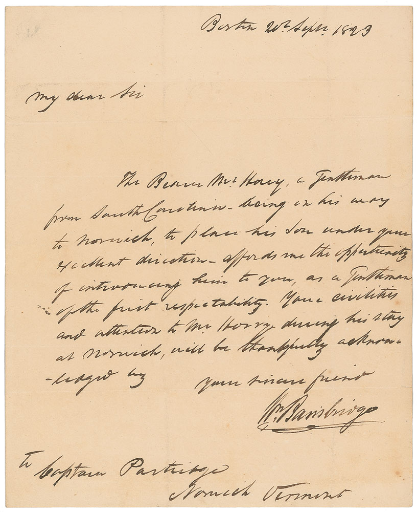 Commodore in the United States Navy (1774–1833) best known for his victory over the HMS Java in the War of 1812. ALS signed “Wm. Bainbridge,” one page, 8 x 9.75, September 20, 1823. Letter to Captain Alden Partridge of Norwich, Vermont. In part: “The Bearer Mr. Horry…being on his way to Norwich, to place his son under your excellent direction, affords me the opportunity of introducing him to you, as a gentleman of the first respectability.” In fine condition, with intersecting folds (one vertical fold passing through a single letter of the signature). A choice, boldly penned letter by the famed commodore. Pre-certified PSA/DNA.