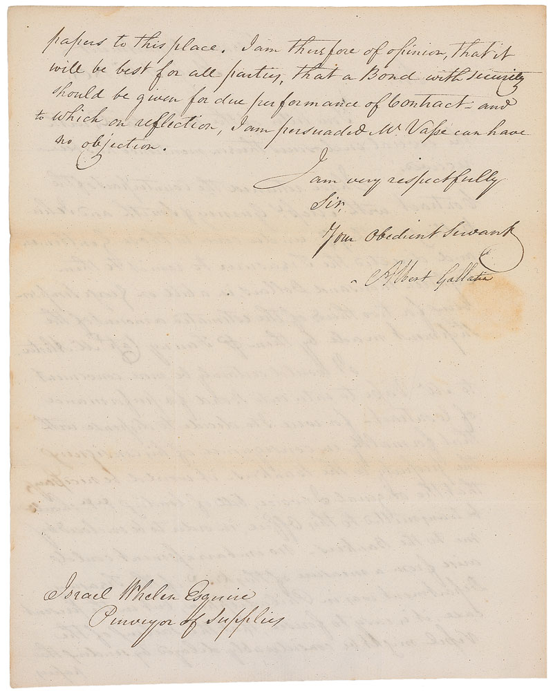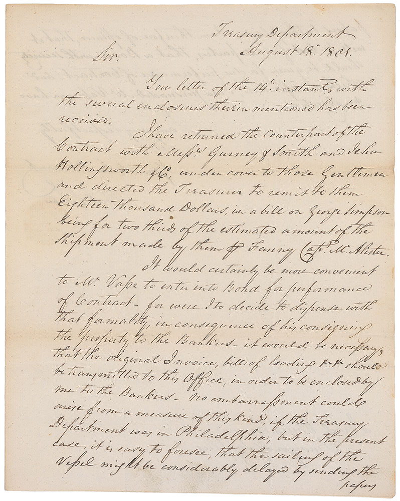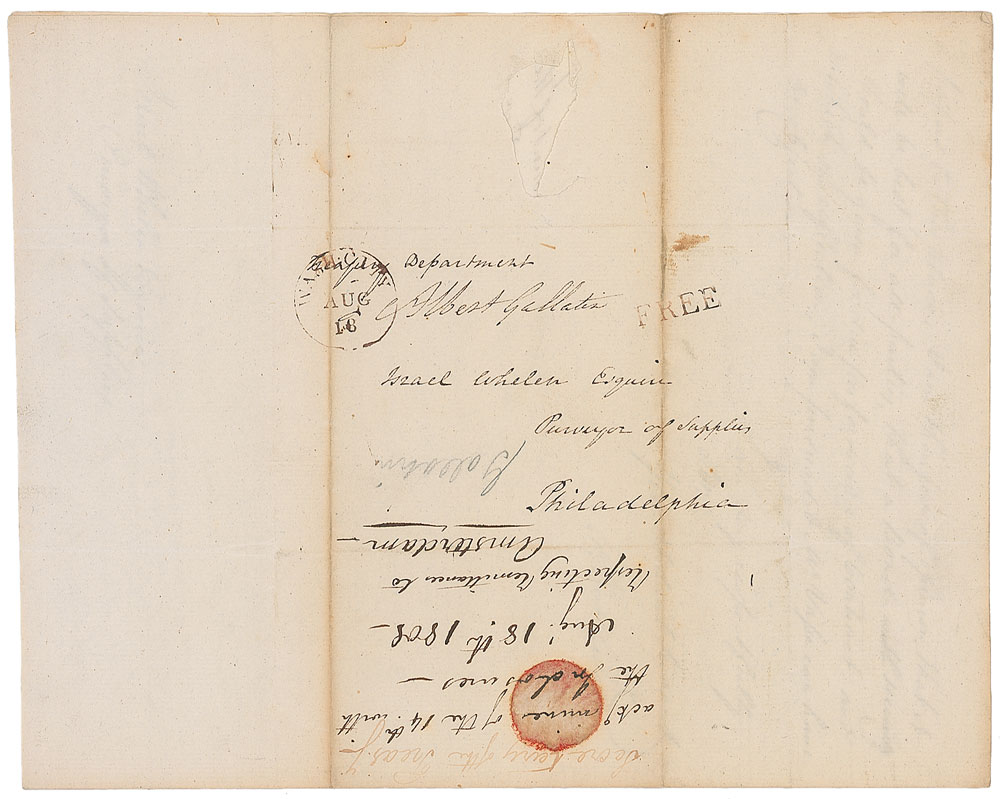 Politician and financial genius (1761–1849) responsible for the formation of what is now known as the Ways and Means Committee. LS, one page both sides, 8 x 10, August 18, 1801. Letter to Israel Whelen. In part: “I have returned the counterpart of the contract with Messrs Gurney & Smith and Jehu Hollingsworth & Co…and directed the Treasurer to remit to them Eighteen thousand dollars, in a bill on George Simpson being for two thirds of the estimated amount of the shipment made by them.” The address panel on the reverse of the second integral page is filled out in another hand but free franked at the top by Gallatin, “Albert Gallatin.” In fine condition, with intersecting folds and subtle toning. Pre-certified PSA/DNA and RR Auction COA.