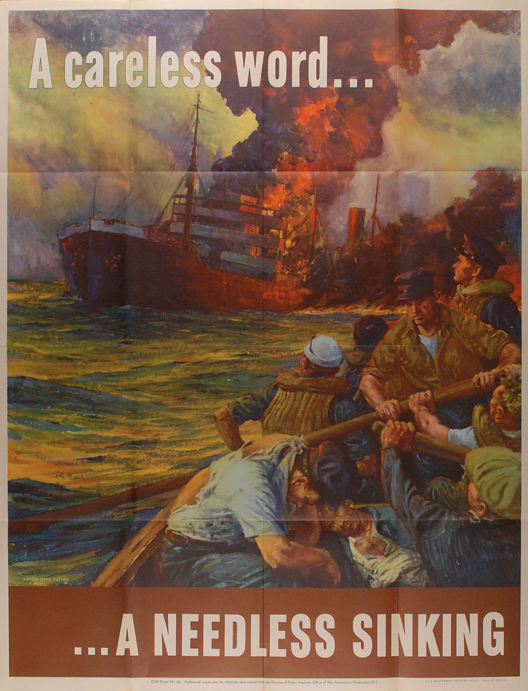Original color 28.5 x 37 World War II patriotic poster from 1942, O. W. I. 524, with art done by Anton Otto Fischer, showing a battleship going up in flames as the few battered survivors row away, with “A careless word…a needless sinking,” printed above and below the image. Printed at the bottom is “U.S. Government Printing Office: 1942-O-502219.” In fine condition, with a couple of small separations to intersecting folds, and some mild toning and edge dings to borders. RR Auction COA.