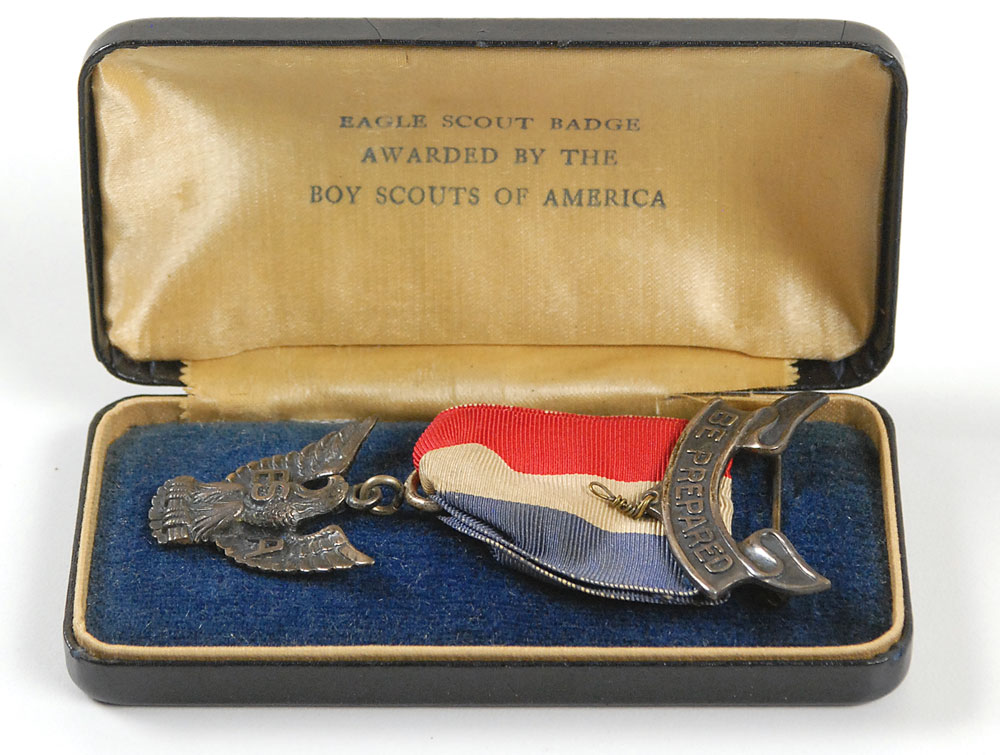 McNamara’s personally-owned Boy Scouts of America Eagle Scout badge, featuring a metal banner pin that reads “Be Prepared,” a patriotic ribbon, and a metal eagle pendent with raised lettering reading “BSA,” measuring 3.25″ long. Includes the original presentation box, embossed inside the cover, “Eagle Scout Badge, awarded by the Boy Scouts of America.” In fine condition, with expected age toning and tarnishing. Accompanied by the tag from Sotheby’s sale of the McNamara estate held in October 2012, where this was acquired. McNamara graduated from Piedmont High School in California at age 17 in 1933, where he was president of the Rigma Lions Boys Club and earned the rank of Eagle Scout. RR Auction COA.