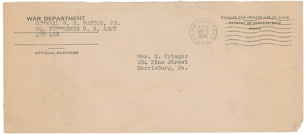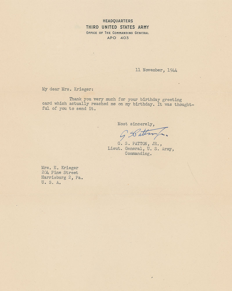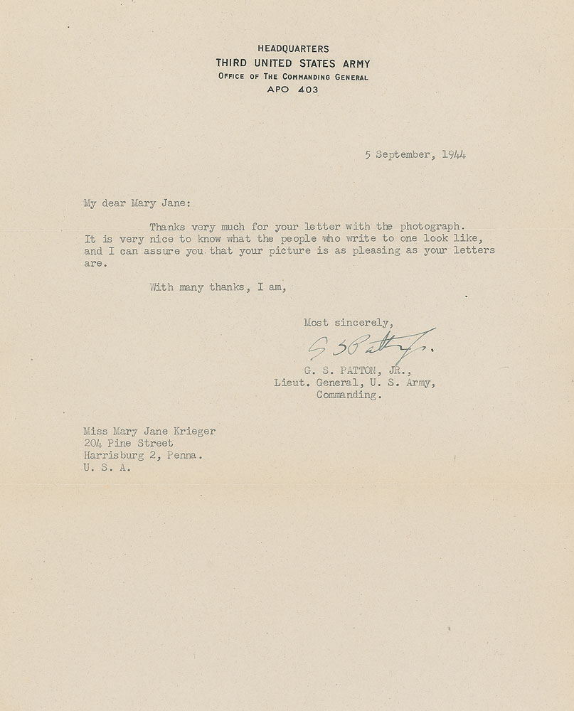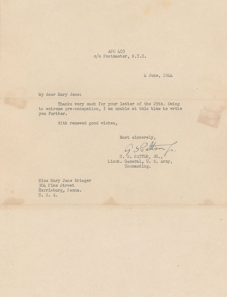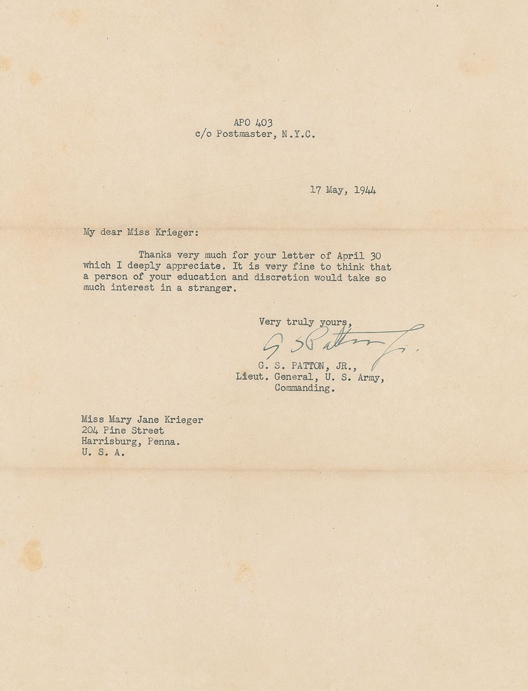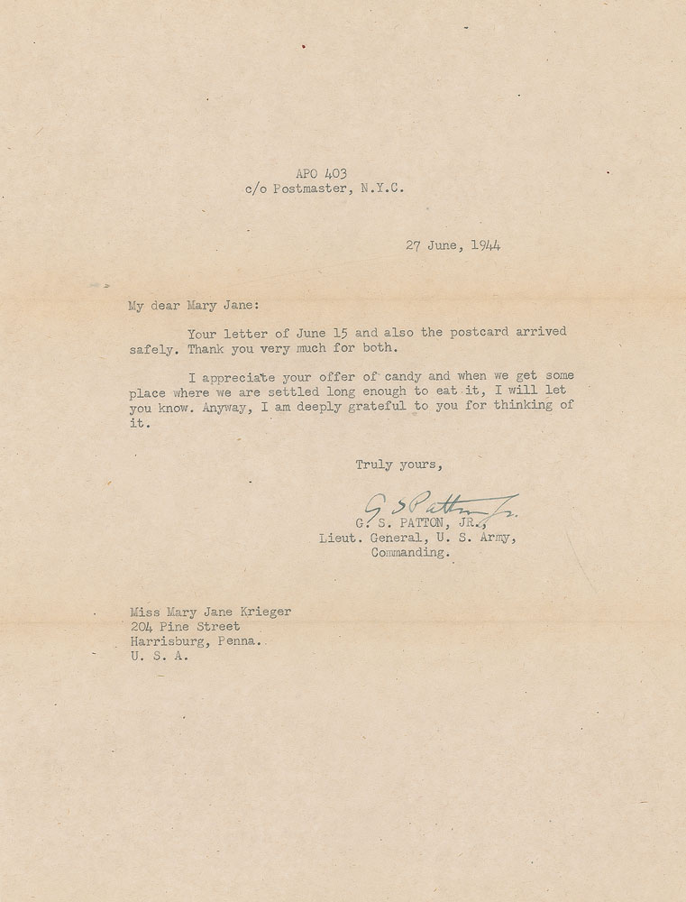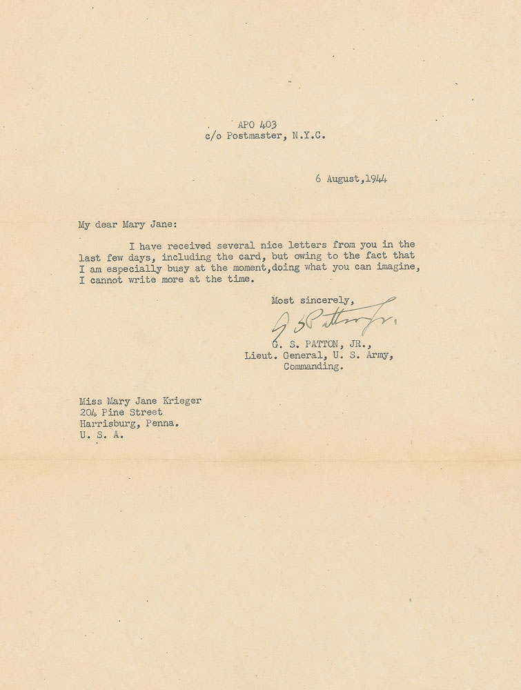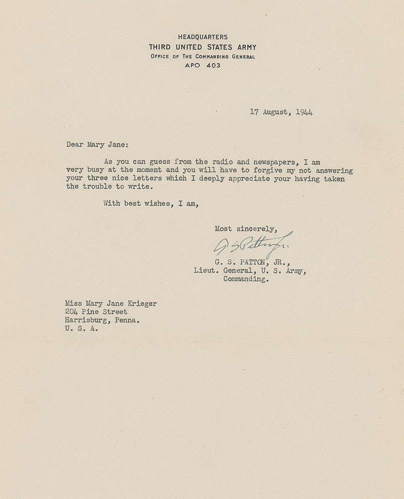 Remembered as the hard-driving, unrelenting military hero who led head-first through World War II’s most important operations—the Invasion of Sicily, the rapid drive across France following the Invasion of Normandy, the relief of Bastogne during the Battle of the Bulge—General Patton’s steady correspondence with a young Harrisburg, Pennsylvania, woman by the name of Mary Jane Krieger reveal a much kinder side of the general. These letters, most affectionately addressed to “My dear Mary Jane,” offer kind remarks of appreciation for packages sent and apologies for delayed correspondence, many of them being sent during his busiest times during the war. Patton wrote to her until his final days—one of the last four letters he ever wrote was to thank her for a book of poems she sent as a Christmas gift. Wonderful archive of eight TLSs from Patton to Krieger, each signed “G. S. Patton, Jr.,” one page, 8 x 10.5, dated between May 17, 1944, and November 8. 1945, with all but one being war-dated. Most contain general content, briefly responding to Krieger’s letters and thank her for her support. In his letter of June 4, 1944—just two days before D-Day—he writes, in part: “Owing to extreme pre-occupation, I am unable at this time to write you further.” Although Patton did not directly participate in the D-Day landings at Normandy, he served as a decoy and went to England, drawing Axis defenses to the north of France to create weakness in the southern regions where the attack was actually planned. His letter of June 27, in part: “I appreciate your offer of candy and when we get some place where we are settled long enough to eat it, I will let you know.” At this time, Patton and his Third US Army was moving from England to France, where they would gain much ground in July, hence the uncertainty of his exact whereabouts. His next letter, sent on August 6, came as they rapidly advanced through France. In part: “Owing to the fact that I am especially busy at the moment, doing what you can imagine, I cannot write more at the time.” Advancing first into Brittany and then swinging eastward, Patton’s Third Army traveled over 250 miles across France. It crossed the Seine River southeast of Paris in late August. In a later letter, sent on November 11, 1944, Patton writes, “Thank you very much for your birthday greeting card which actually reached me on my birthday. It was thoughtful of you to send it.” This letter was actually sent on his birthday which, interestingly, shares its November 11 date with Armistice Day. Also present is Krieger’s scrapbook and her handwritten draft of a telegram she sent to Patton after learning of his car accident. Her telegram is dated December 14, 1945, six days after his car accident in Germany, and reads simply, “My very best wishes.” Unfortunately, Patton would pass away from his wounds on December 21. Kriger’s large scrapbook contains many affixed photos and newspaper clippings related to Patton, most importantly including Patton’s 2.25″ diameter red, white, and blue Third US Army cloth patch most assuredly sent to her by the general. Letters in overall fine condition. An outstanding chronicle of a well-known correspondence, spanning some of the most critical days of the war. RR Auction COA.