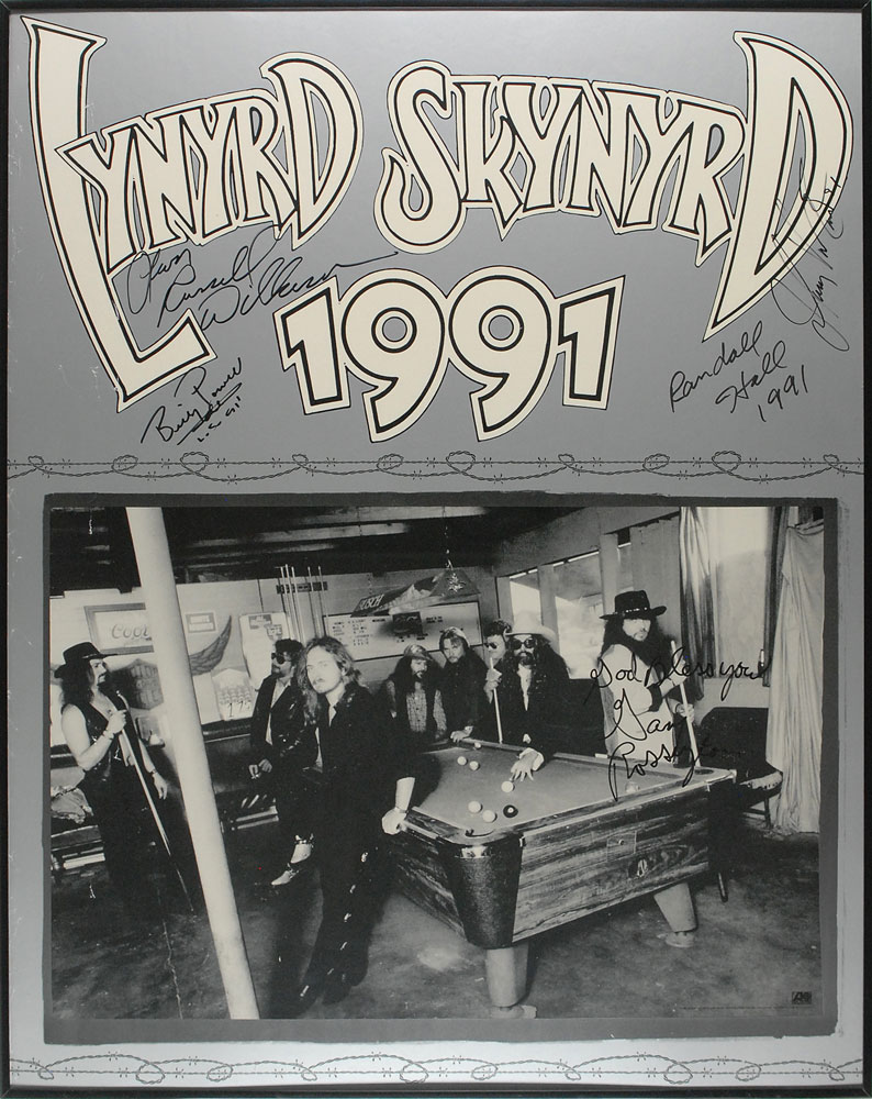 Promotional poster from 1991, 21.5 x 27.75, signed in black felt tip by Johnny Van Zandt, Billy Powell, Gary Rossington, Randall Hall, and Leon Wilkeson. Framed to an overall size of 22.25 x 28. In fine condition, with some creases to left side and edge. Pre-certified Roger Epperson/REAL and RR Auction COA.