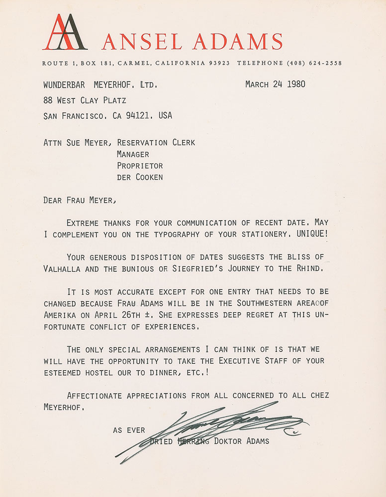 TLS, one page, 8.5 x 11, personal letterhead, March 24, 1980. Humorous letter to the wife of the CEO of Paul Masson Vineyards. In part: “Extreme thanks for your communication of recent date. May I complement you on the typography of your stationery. UNIQUE! Your generous disposition of dates suggests the bliss of Valhalla and the bunious [sic] of Siegfried’s Journey to the Rhind [sic, Rhine]. It is most accurate except for one entry that needs to be changed because Frau Adams will be in the Southwestern area of Amerika on April 26th. She expresses deep regret at this unfortunate conflict of experiences.” Adams has signed above the typed notation which reads, “Dried Herring Doktor Adams.” In fine condition. Pre-certified PSA/DNA and RR Auction COA.