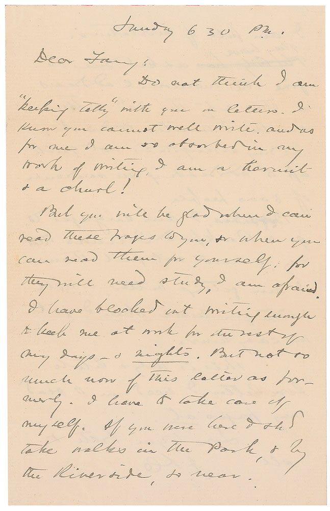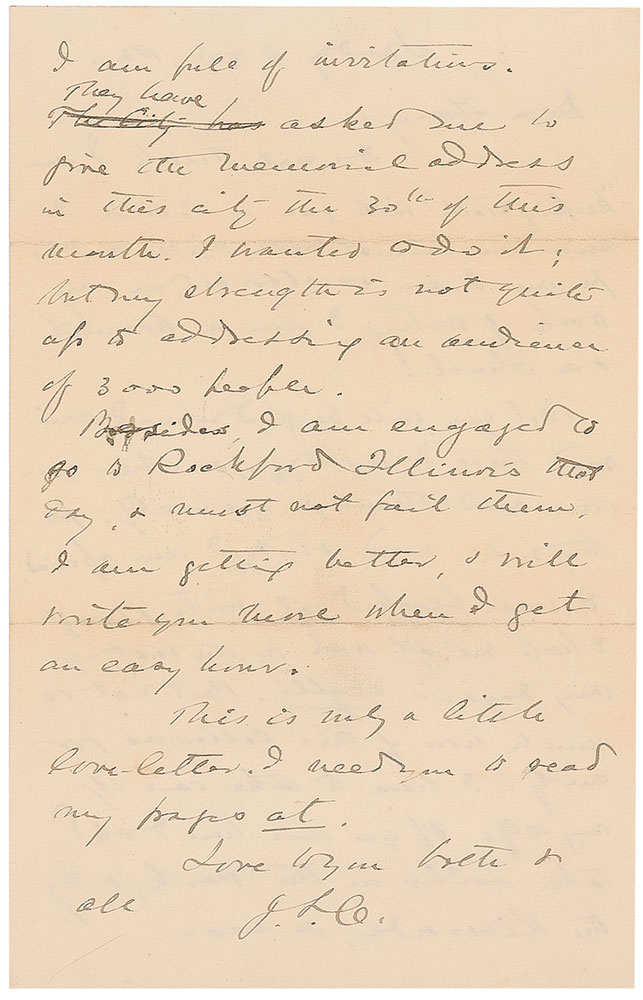 Maine-born Union major general (1828–1914) who was awarded the Congressional Medal of Honor for his defense of Little Round Top at Gettysburg. He later served as Governor of Maine and president of Bowdoin College. ALS signed “J. L. C.,” one page both sides, 5 x 7.75, no date, but postmarked May 3, 1891. Letter to his wife written from New York. In part: “Do not think I am ‘keeping tally’ with you in letters. I know you cannot well write and as for me I am so absorbed in my work of writing I am a hermit & a churl! Bet you will be glad when I can read these pages to you, & when you can read them for yourself, for they will need study, I am afraid I have blocked out writing enough to keep me at work for the rest of my days—& nights…If you were here I shd take walks in the Park, & by the River side, so near. I am full of invitations. They have asked me to give the memorial address in this city the 30th of this month. I wanted to do it; but my strength’s not quite up to addressing an audience of 3000 people. Besides, I am engaged to go to Rockford Illinois that day…I am getting better. I will invite you here when I get an easy hour. This is only a little love-letter.” In fine condition. Accompanied by a color photocopy of the original mailing envelope and a collection of 17 items including six letters (one in German and one in French), and seven envelopes, dated 1878–1900, to General or Mrs. Chamberlain. Pre-certified PSA/DNA and RR Auction COA.