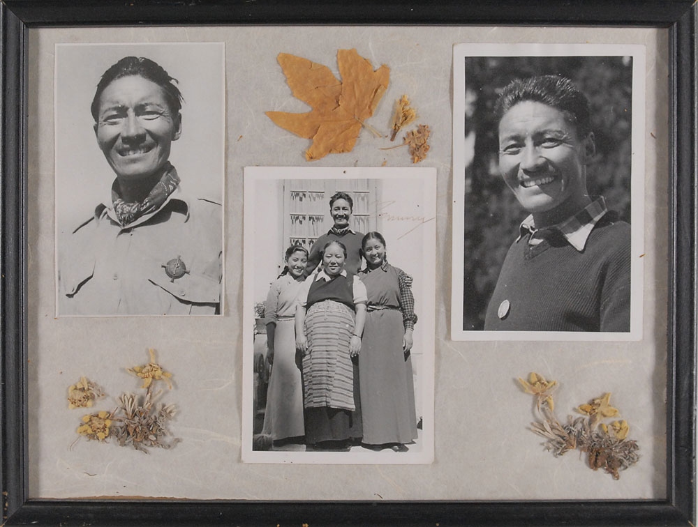 Sherpa guide (1914–1986) who, along with Edmund Hillary, was a member of the first party to reach the summit of Mount Everest in 1953. Vintage matte-finish 3.5 x 5.5 photo of Norgay posing with his family, signed in fountain pen, “Tenzing.” Framed with two other unsigned photos and dried specimens of several plants local to Norgay’s area. In fine condition, with a tack hole to top border and signature a few shades light, but completely legible. RR Auction COA.