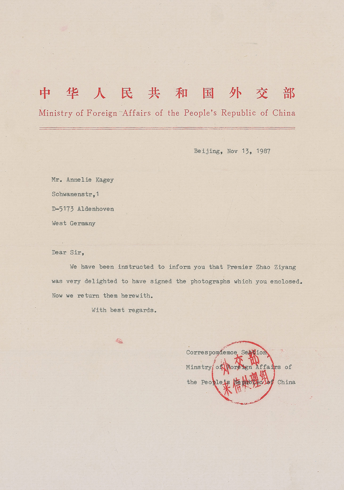 High-ranking politician in the People's Republic of China (1919–2005) instrumental in implementing free-market reforms. Scarce color glossy 6 x 4 photo of Zhao Ziyang at an international meeting with Helmut Kohl, signed in black felt tip by both leaders. In fine condition. Accompanied by a letter of transmittal from the Chinese ministry of foreign affairs, dated 1992.