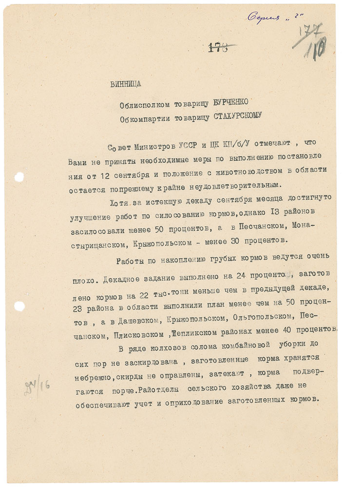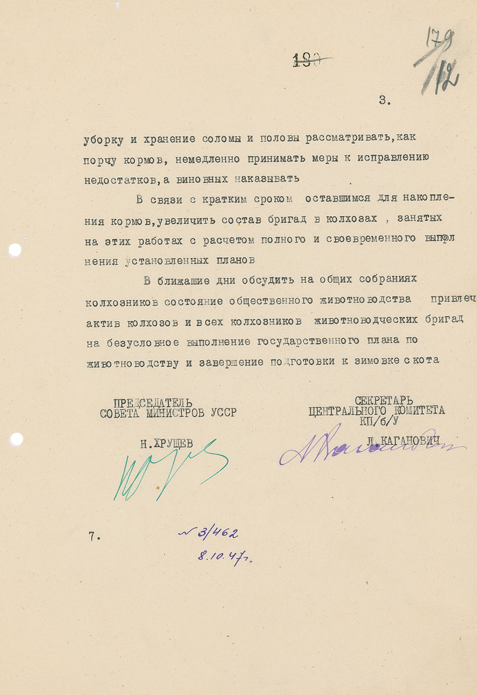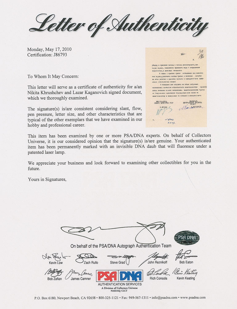 TLS in Cyrillic, signed “N. Khrushchev,” three pages, 8 x 11.25, no date. In part (translated): “There are some achievements…with fodder silage, but 13 regions put on silage less than 50%…straw after combine harvesting is not stacked, already stored fodder is kept carelessly, stacks are not in a proper condition…and as a result—fodder spoils. Regional agricultural departments do not even provide accounting for stocked fodder…Pay special attention for opportune harvest of corn stalks, sugar beet tops and other cultivation waste as cattle fodder…negligence during harvesting and keeping of straw must be considered as fodder damage and those persons who are guilty must be punished immediately.” Signed at the conclusion by Khrushchev as chief council of ministers, and countersigned by Lazar Kaganovich as secretary of party central committee of Ukraine. In fine condition, with filing holes to left side and various office notations. Accompanied by a full letter of authenticity from PSA/DNA. RR Auction COA.