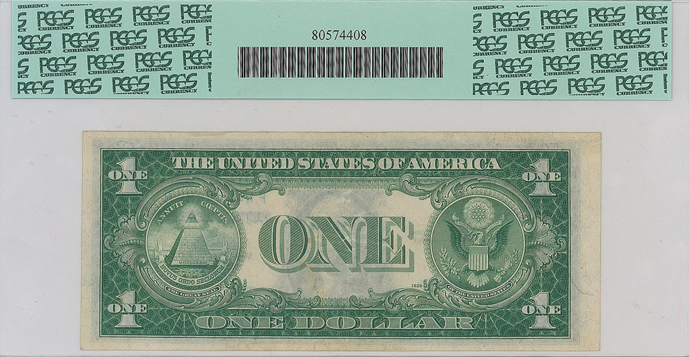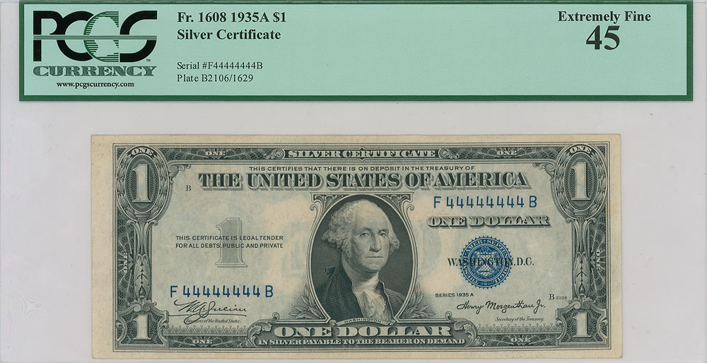 Rare Series 1935A one dollar silver certificate, serial No. F44444444B. Certificate is housed in a PCGS authentication holder, grading the certificate “Extremely Fine 45.” With only nine of these ‘solids’ printed within every series, these are highly prized by numismatic collectors. RR Auction COA.