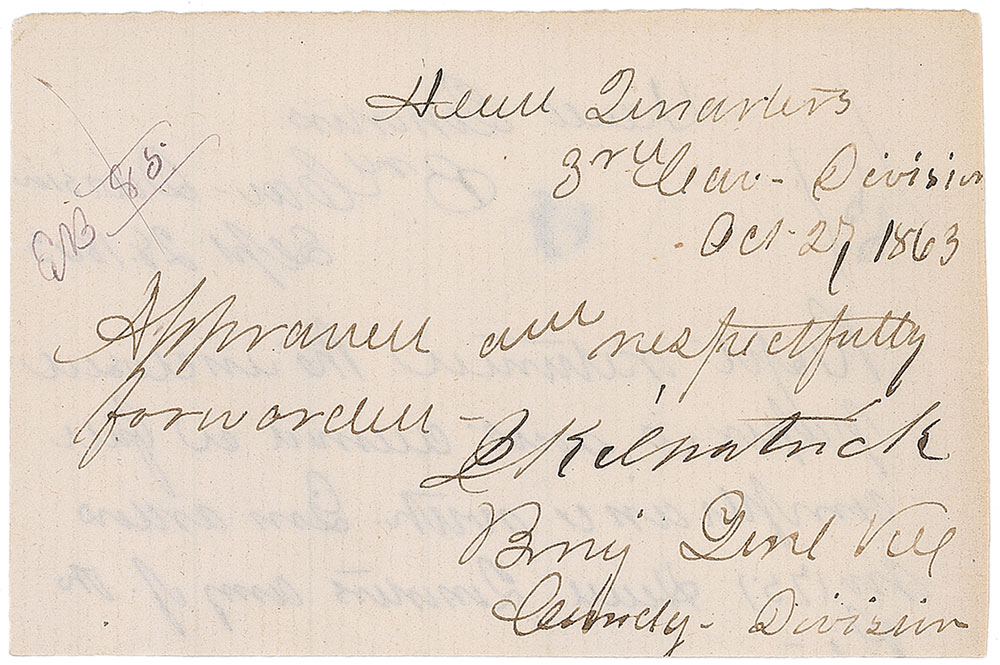American military officer (1836–1881), who, as a general in the Civil War, earned the sobriquet ‘Kill-Cavalry’ for his gung-ho disregard for the lives of the soldiers under his command. Civil War–dated ink endorsement signature, “J. Kilpatrick,” concluding a manuscript note on an off-white 3.25 x 2 slip clipped from a docketing panel, October 27, 1863, in full: “Approved and respectfully forwarded.” In fine condition. RR Auction COA.