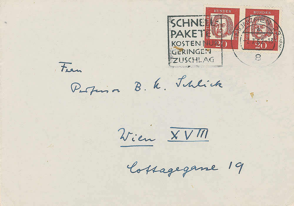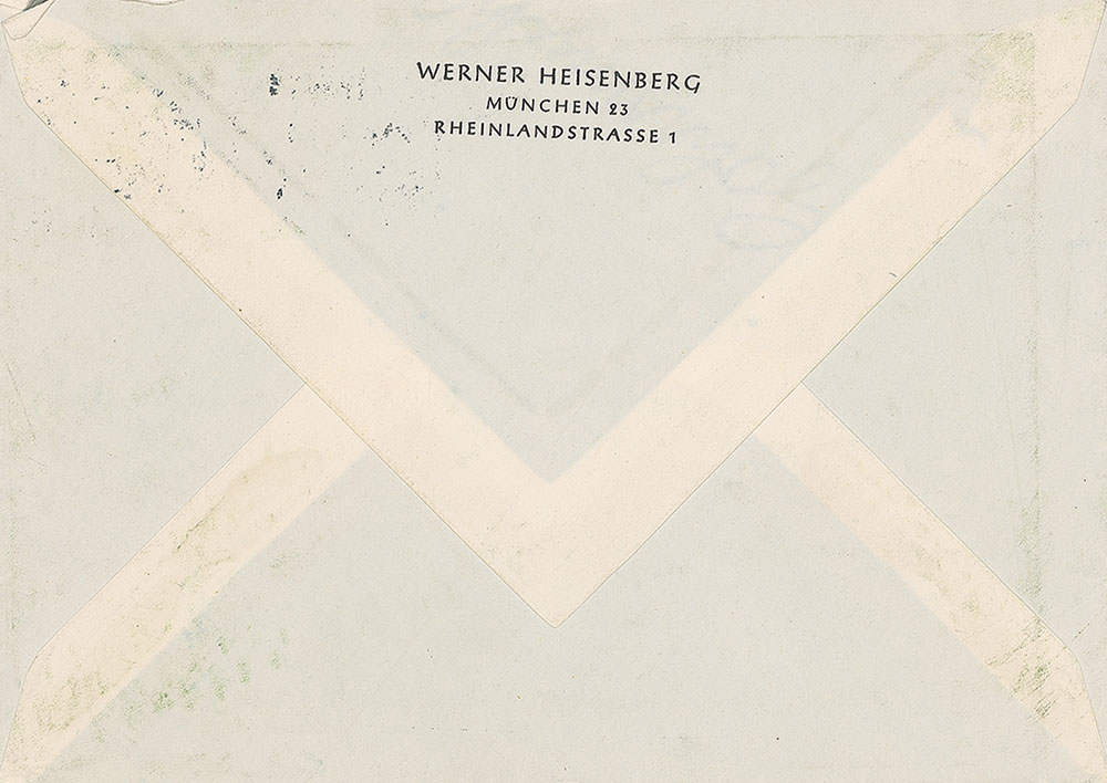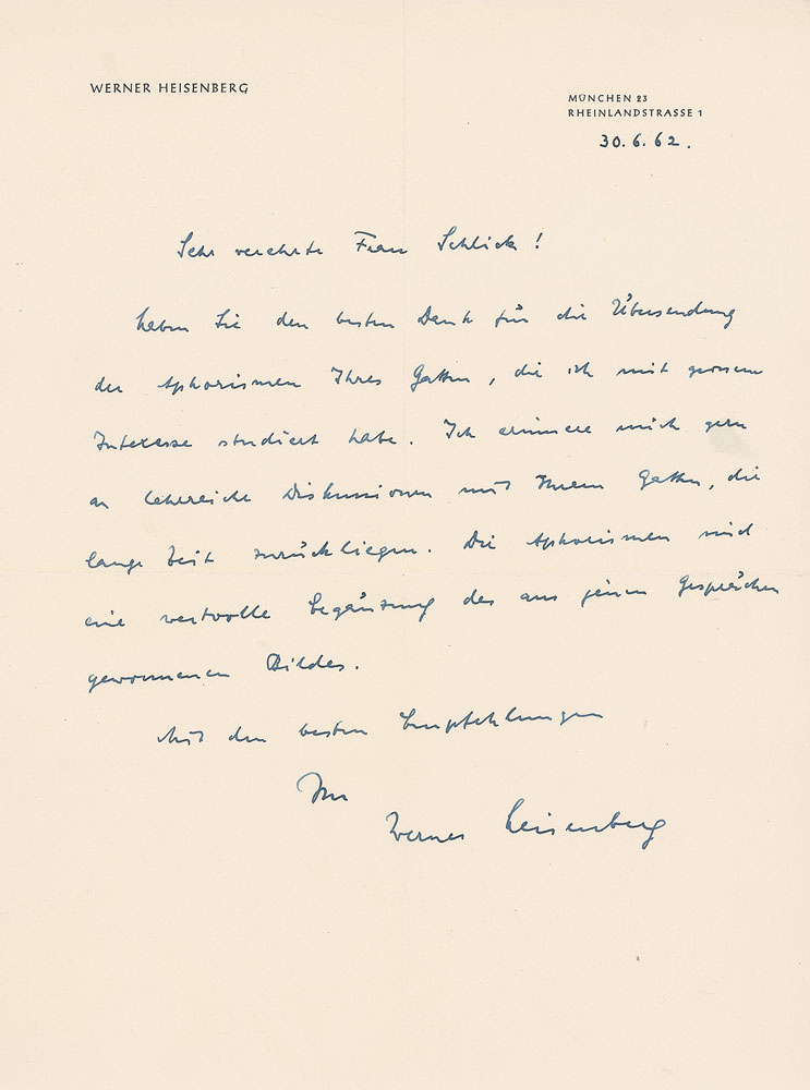 German theoretical physicist (1901–1976) awarded the 1932 Nobel Prize in Physics for the creation of quantum mechanics. ALS in German, one page, 8.25 x 11, personal letterhead, June 30, 1962. Untranslated letter to Blanche Schlick, widow of Moritz Schlick, thanking her for sending a copy of her husband’s posthumously published book of aphorisms. In fine condition, with intersecting folds. Accompanied by the original mailing envelope, addressed in Heisenberg’s own hand. The book, entitled ‘Aphorismen,’ was a small volume of aphorisms complied and edited by Blanche Schlick, first released in 1962. Heisenberg and Moritz Schlick had begun corresponding around 1930, and they shared similar scientific and philosophic worldviews. A scarce handwritten letter with an important association between influential physicists. Pre-certified PSA/DNA and RR Auction COA.