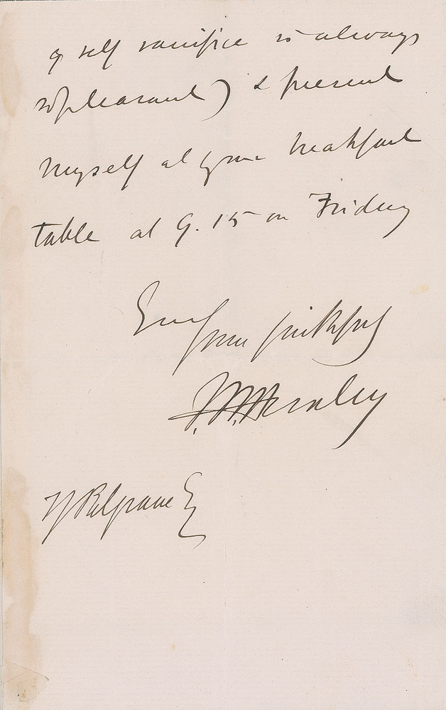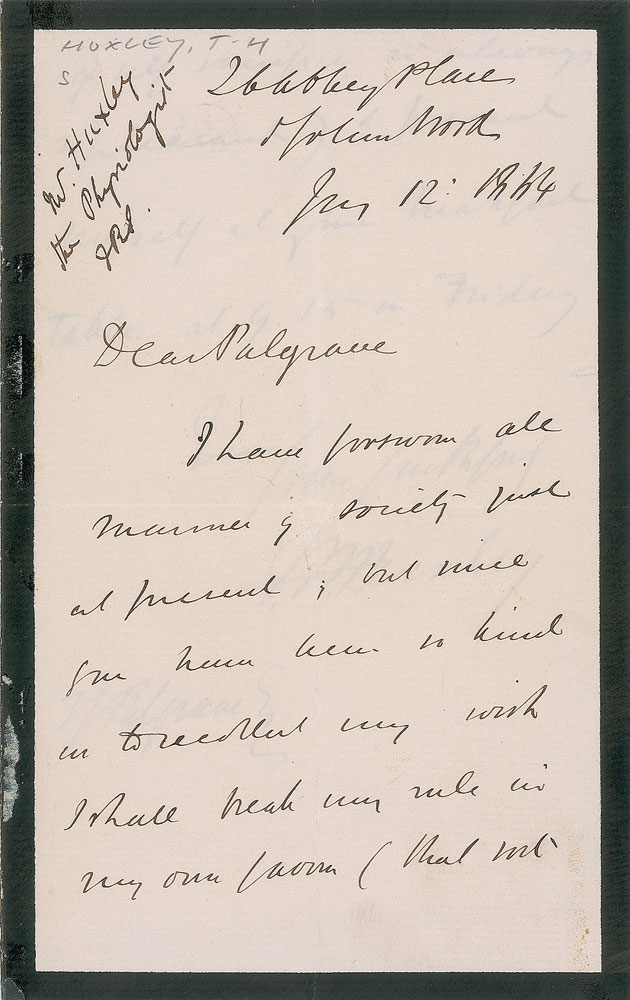 English biologist (1825-1895) known as ‘Darwin's Bulldog’ for his advocacy of Charles Darwin's theory of evolution. ALS signed “T. H. Huxley,” two pages on two adjoining sheets, 4.5 x 7, black-bordered stationery letterhead, June 12, 1844. Huxley accepts a breakfast invitation. In part: “I have forsworn all manners of society just at present, but since you have been so kind…I shall break my rule…& present myself at your breakfast table.” In fine condition, with central horizontal and vertical folds, pencil notation and small mounting remnant to first page, small docketing notation in the recipient’s hand to first page, and a vertical mounting remnant along reverse of second integral page. RR Auction COA.