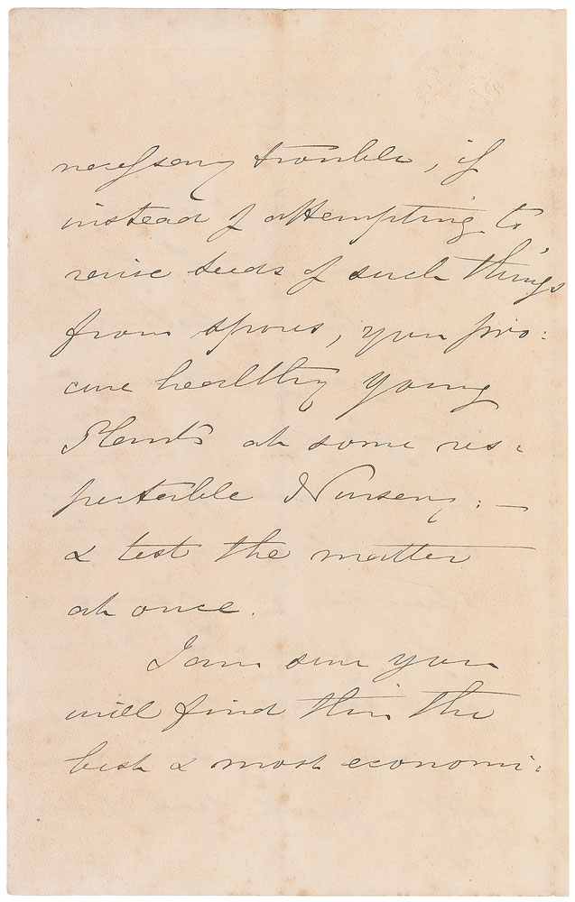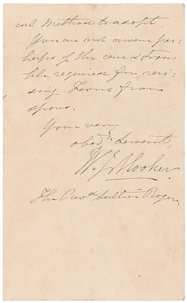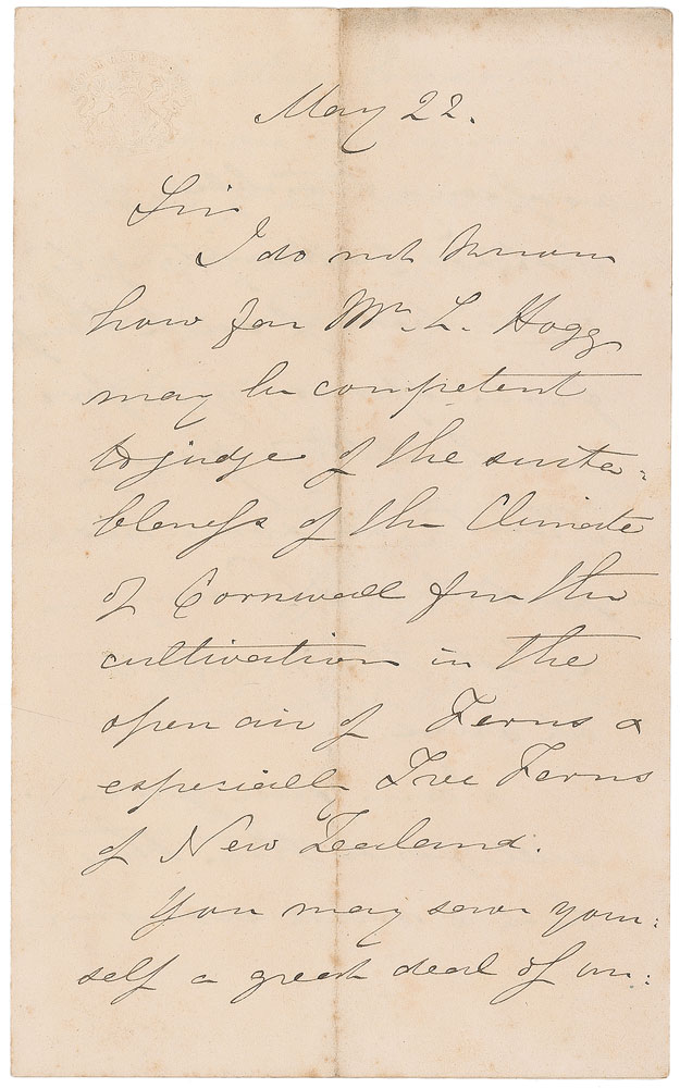English botanist and botanical illustrator (1785–1865). ALS signed “W. J. Hooker,” three pages on two adjoining sheets, 4.5 x 7, May 22. In part: “I do not know how…Mr. L. Hogg may be competent to judge…the Climate of Cornwall for the cultivation in the open air of Ferns & especially Tree Ferns of New Zealand. You may save yourself a great deal of unnecessary trouble, if instead of attempting to revive seeds from spores, you procure healthy young stems at some respectable Nursery & test the matter at once.” Central horizontal and vertical folds, and some scattered light toning and soiling, otherwise fine condition. RR Auction COA.