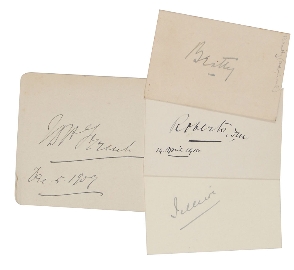 Ink signatures of four different British military leaders on various size off-white cards. Signers are: William D. French, Frederick Roberts, John Jellicoe, and David Beatty. In fine condition, with some scattered light toning and soiling, and a small pencil notation to one card. RR Auction COA.