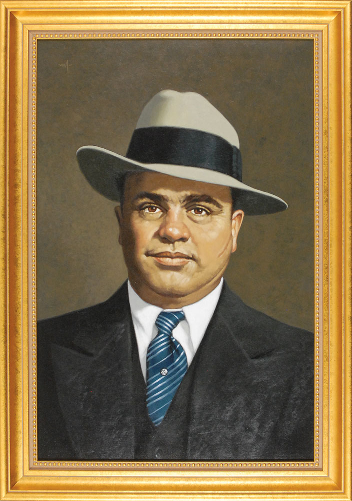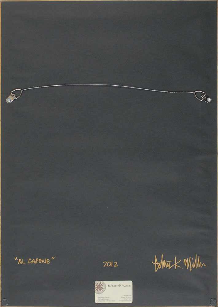 Well-done and impressive original painting entitled ‘Al Capone,’ by artist Arthur K. Miller in 2012, acrylic on Masonite, 11.5 x 17.5, depicting Capone staring out intently from under his gray fedora. Signed in the upper left corner, “M,” and signed on the reverse of the backing of the frame in gold ink, “‘Al Capone,’ Arthur K. Miller, 2012.” Framed to an overall size of 14.5 x 20.5. In very fine condition. An artist from York Beach, Maine, Miller’s acrylic paintings are collected internationally. They have graced the covers of many publications, and some were featured in a one-man show at the National Baseball Hall of Fame for more than five years. RR Auction COA.