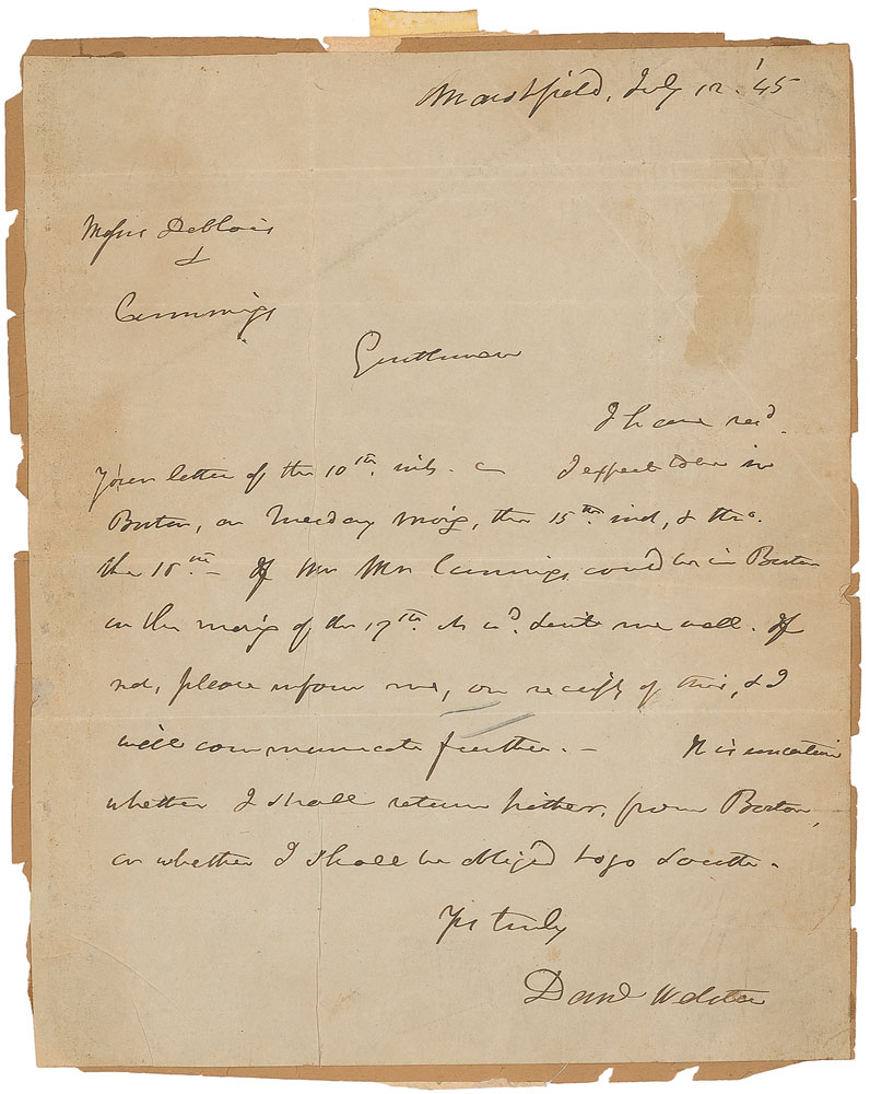 ALS signed “Dan’l Webster,” one page, 7.5 x 9.25, July 12, 1845. Letter to two gentlemen. In part: “I expect to be in Boston on Tuesday…It is uncertain whether I shall return hither from Boston or whether I shall be obliged to go South.” Affixed to a brittle scrapbook page. In very good condition, with numerous intersecting folds and scattered creases, and a few light stains. Accompanied by an attractive slipcase. Pre-certified PSA/DNA and RR Auction COA.