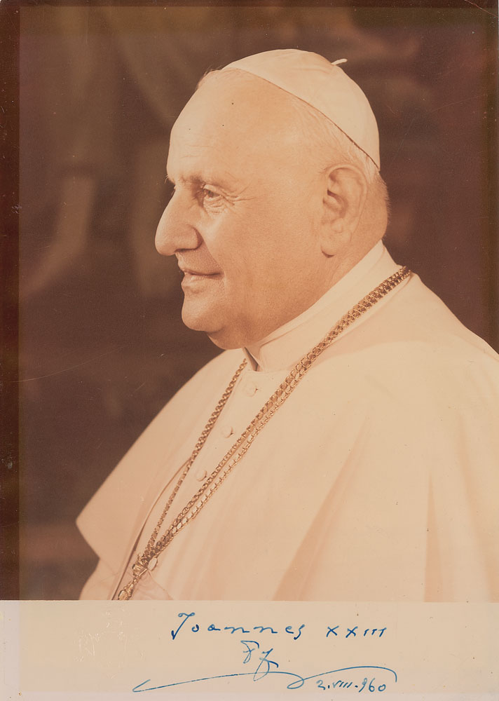 Italian Pope (1881–1963), born Angelo Giuseppe Roncalli, who ascended the papal throne in 1958 and served until his death. As the guiding force behind the historic Second Vatican Council, John ushered in the most sweeping reforms the Catholic Church had undergone in centuries. Rare color glossy 6.75 x 9.5 photo of Pope John XXIII, signed in the lower border in fountain pen, “Joannes XXIII,” and dated “August 2, 1960.” The lower border also bears an embossed papal seal. A crease and paperclip impression to top edge, a subtle overall block of toning, and uniformly trimmed edges, otherwise fine condition. All examples of John XXIII we have previously offered were signed as cardinal using his given name, making this an especially rare piece; it is also the only color photo of him that we have ever encountered. Pre-certified PSA/DNA and RR Auction COA.