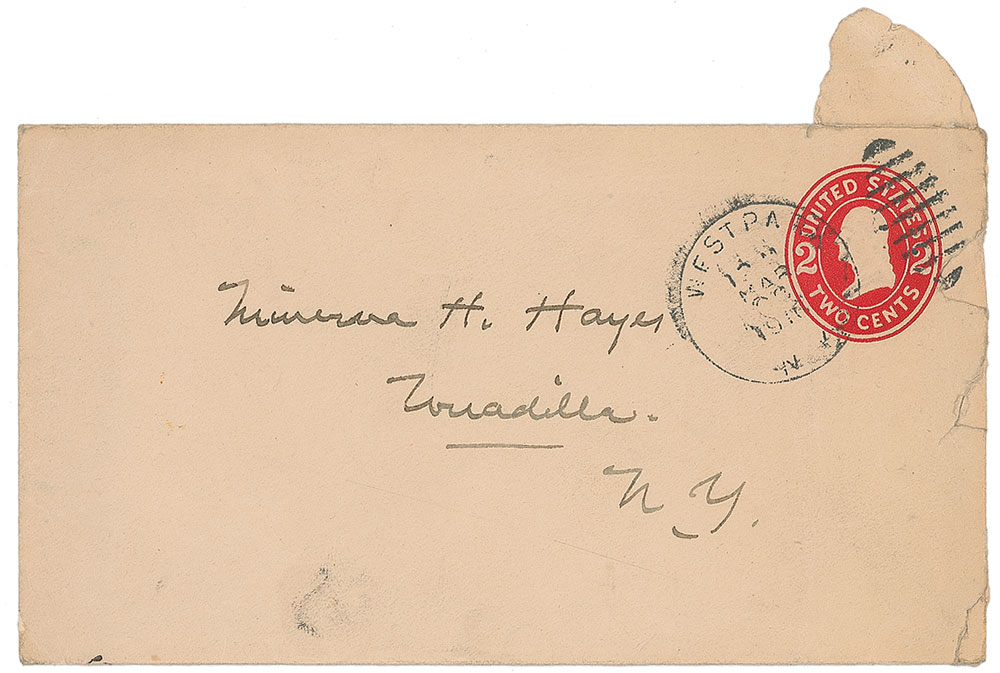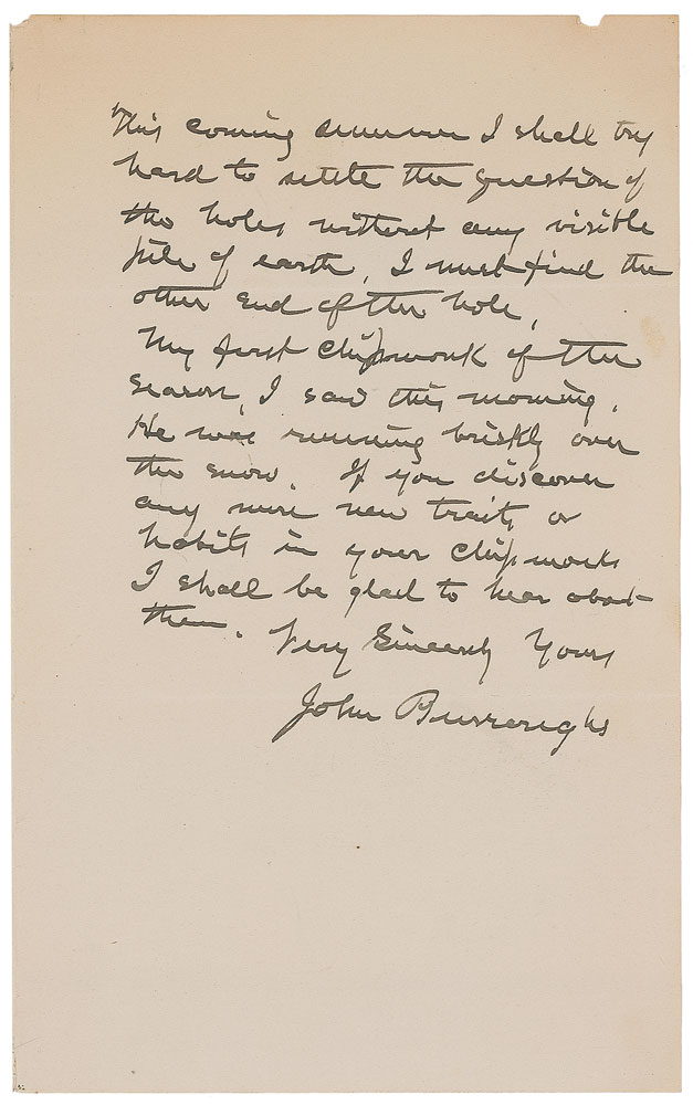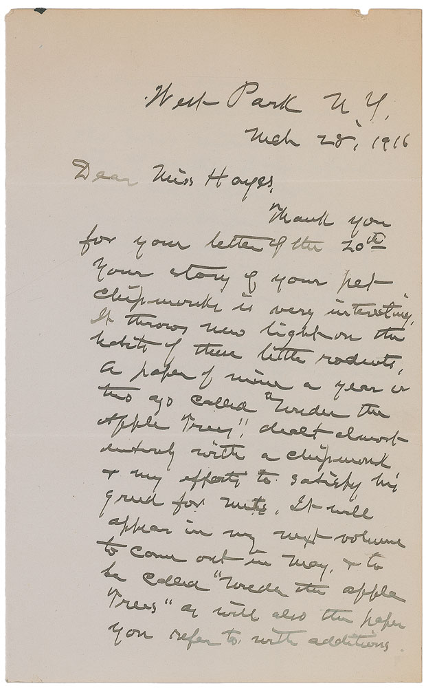 ALS, one page, 5 x 8, March 26, 1916. Letter to Minerva Hayes. In part: “Your story of your pet chipmunks is very interesting. It throws new light on the habits of the little rodents. A paper of mine a year or two ago called ‘Under the Apple Trees’ dealt almost entirely with a chipmunk…My first chipmunk of the season, I saw this morning. He was running briskly over the snow. If you discover any more traits or habits in your chipmunks I shall be glad to hear about them.” In fine condition, with light toning and a chip to the top edge. Accompanied by the original mailing envelope, addressed in Burroughs’s hand. Intriguing content demonstrating Burroughs’s ever-present desire to observe the natural world. Pre-certified PSA/DNA and RR Auction COA.