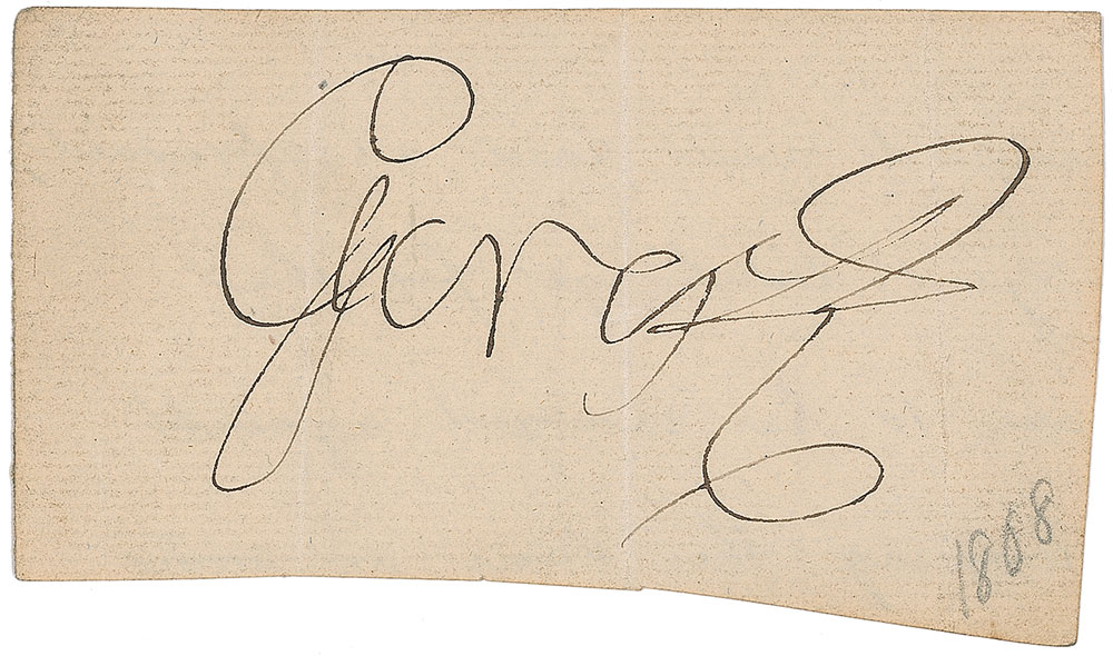 Ink signature, “George R,” on an off-white 4.25 x 2.25 slip. In fine condition, with a central vertical fold. Pre-certified PSA/DNA and RR Auction COA.