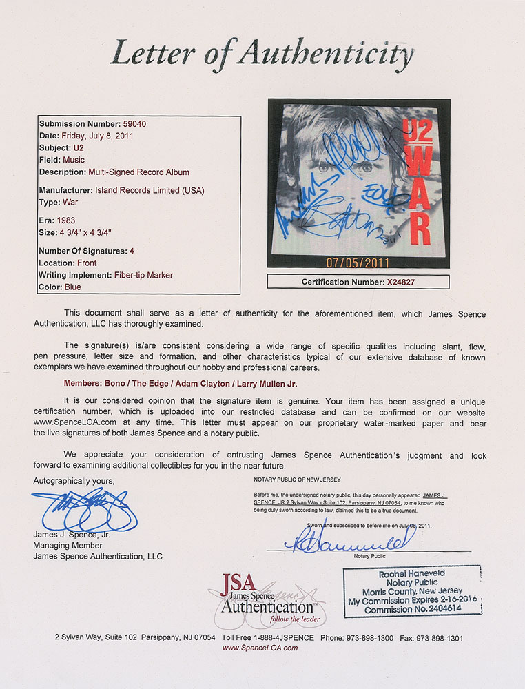 War CD booklet signed on the front cover in blue felt tip, “Bono ‘11,’” “Edge,” “Adam Clayton,” and “Larry Mullen.” In very fine condition. Accompanied by a full letter of authenticity from James Spence. Pre-certified Roger Epperson/REAL and RR Auction COA.