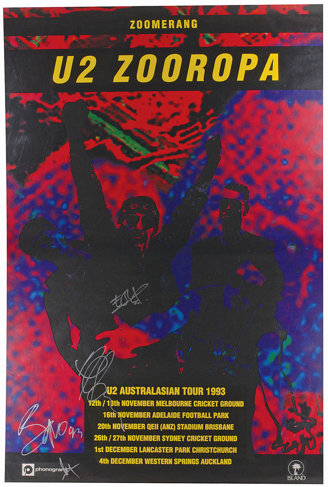 Color 42 x 61 promotional poster for their 1993 Zooropa Australasian tour, signed in silver ink by Bono (adding “93”), Edge, Larry Mullen, and Adam Clayton, all signing first names only. Rolled and in fine condition, with some scattered creases and some edge dings. Pre-certified Roger Epperson/REAL and RR Auction COA.