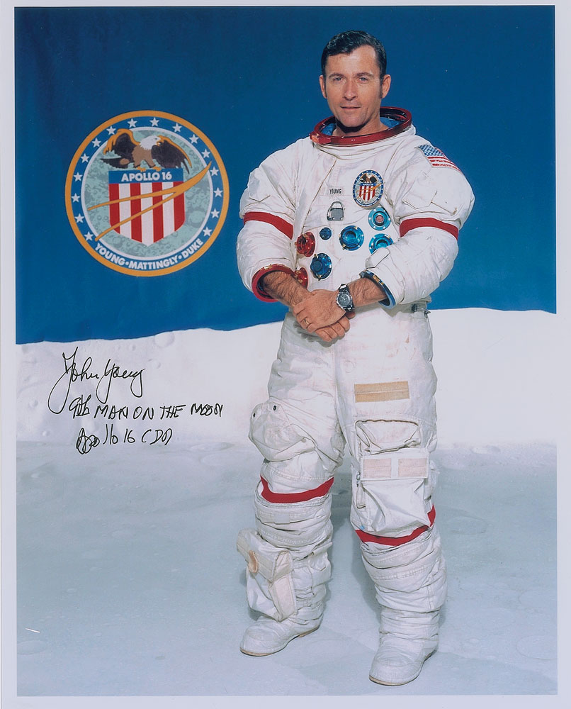 Color satin-finish 8 x 10 full-length photo of Young posing in his white space suit, signed in black felt tip, “John Young, 9th Man on the Moon, Apollo 16 CDR.” In very fine condition. Pre-certified Steve Zarelli and RR Auction COA.