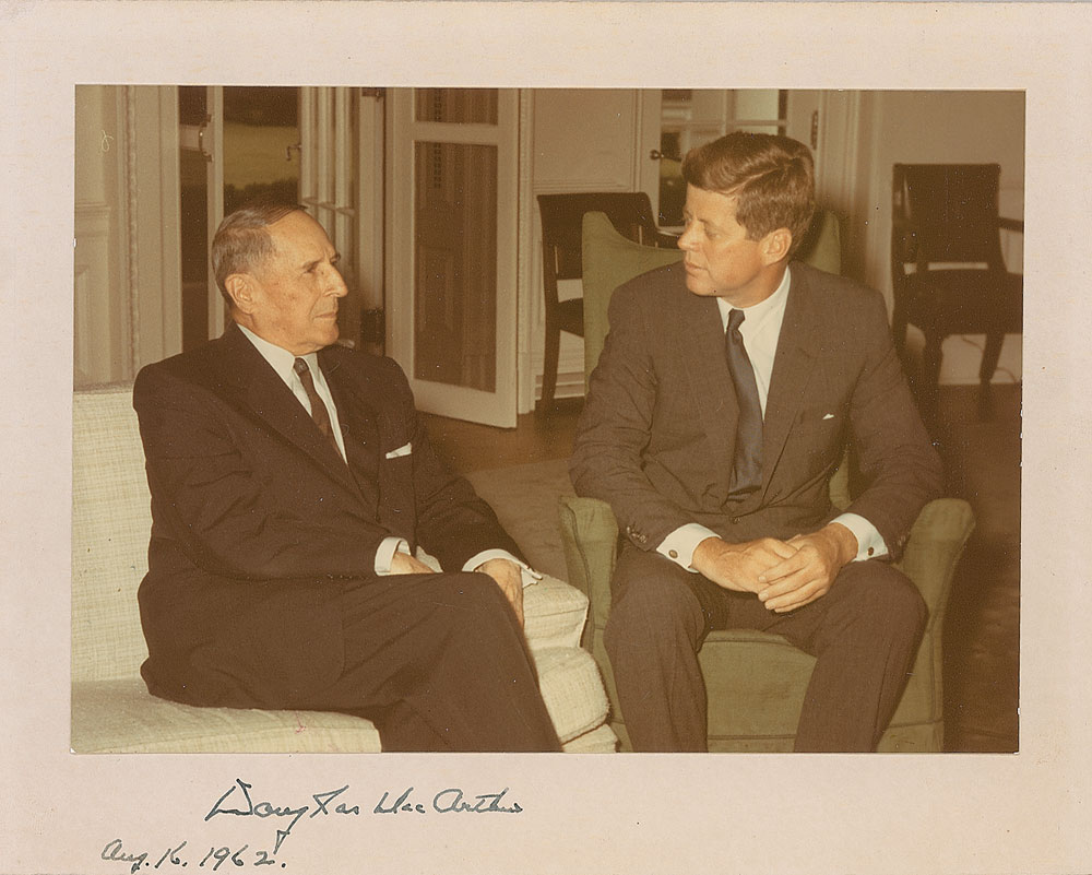 Color matte-finish 8.5 x 6 photo of MacArthur and President John F. Kennedy meeting together, affixed to a 10 x 8 mount, signed on the mount in fountain pen, “Douglas MacArthur, Aug. 16, 1962.” In fine condition, with trimmed edges to the mount. Pre-certified PSA/DNA and RR Auction COA.