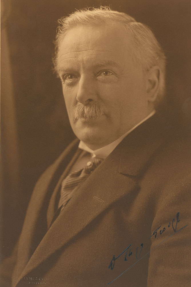 British statesman (1863–1945) who served as prime minister from 1916 to 1922 who was a major player at the Paris Peace Conference of 1919, overseeing the decisions that determined Europe’s postwar future. Choice matte-finish 6 x 9 Harris and Ewing portrait of George in a stately pose, signed in fountain pen, “D. Lloyd George.” Blindstamped in the lower left by the renowned photography studio. Affixed by the top edge to a slightly larger mount. In fine condition. A magnificent image with deep, rich tones. RR Auction COA.