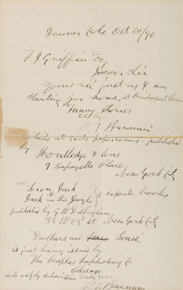 ALS, one page, lightly-lined, 4.75 x 7.5, October 20, 1890. Letter to F. J. Griffin. In full: “Yours recd just at 4 am starting for home at Bridgeport Conn. Funny Stories told by P. T. Barnum retails at 50 cts paper covers published by Boutledge & Sons, 7 Lafayette Place, New York City. Lion Jack & Jack in the Jungle-2 separate books published by G. W. Billingham 33 W 23d St. New York City. ‘Dollars and Sense’ is just being issued by the Peoples Publishing Co, Chicago, sold only by subscription.” Matted and framed with a portrait of Barnum and a colorful 1927 Ringling Bros and Barnum & Bailey tour schedule to an overall size of 20 x 22. In fine condition, with central horizontal and vertical folds, one through a single letter of signature, and some light toning to left side from old tape. Pre-certified PSA/DNA and RR Auction COA.