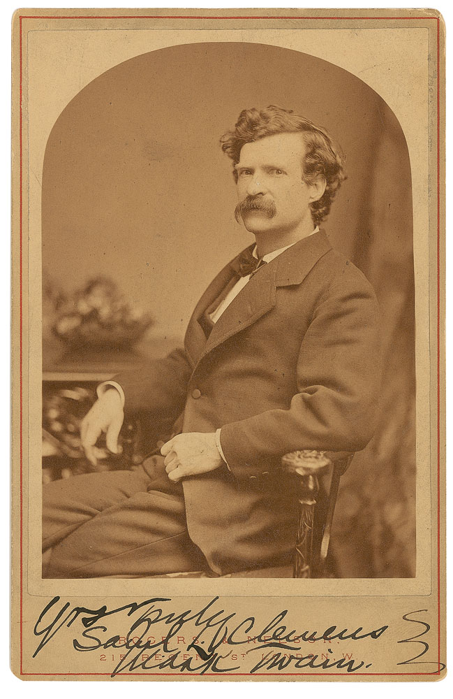 Outstanding original 4.25 x 6.5 cabinet photo of a young Clemens seated in a chair by Rogers and Nelson of London, signed in the lower border in black ink, “Yrs truly, Saml L. Clemens, Mark Twain.” In fine condition, with some light rippling to horizontal edges, and small mounting remnants to reverse. Clemens appears to have sat for this portrait during his greatly successful 1872–73 lecture tour in England, during which he addressed packed houses night after night. Pre-certified John Reznikoff/PSA/DNA.