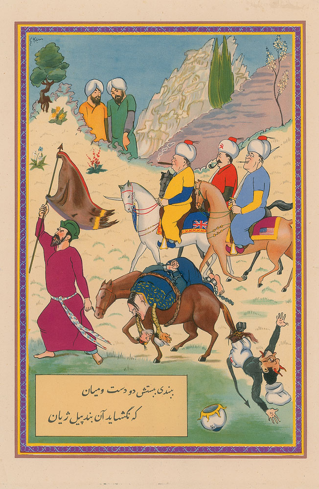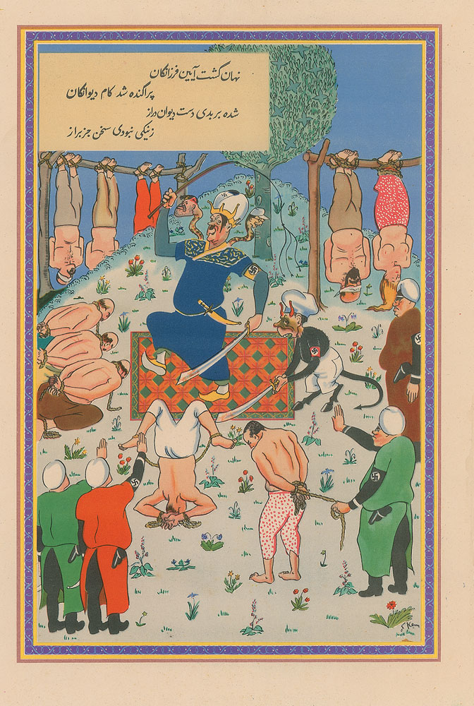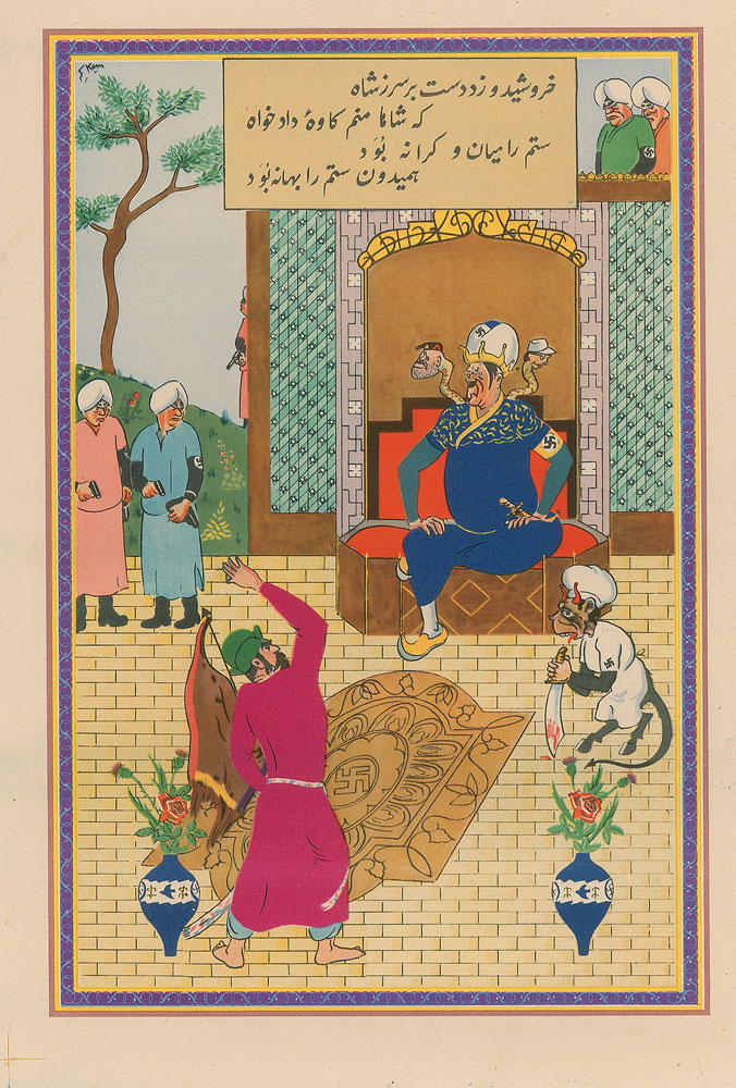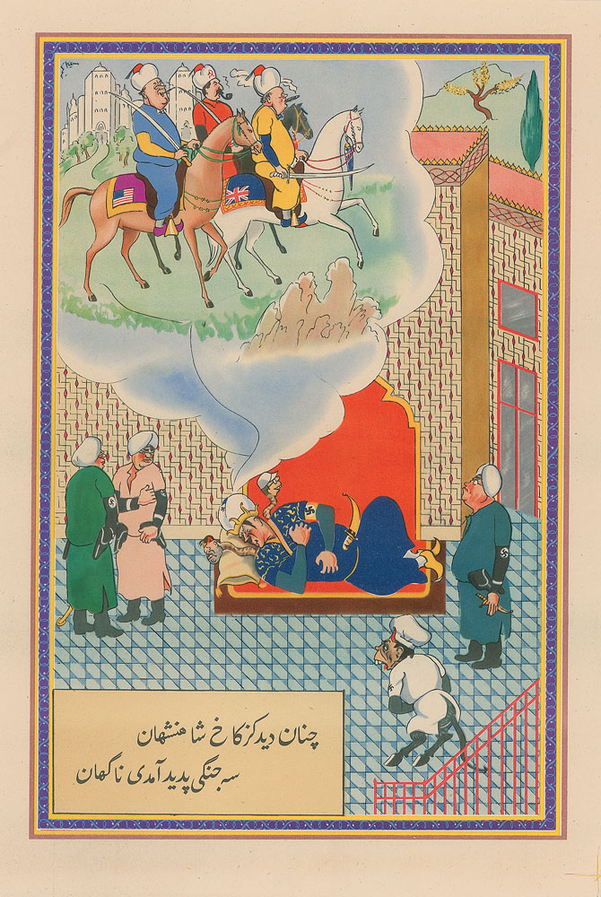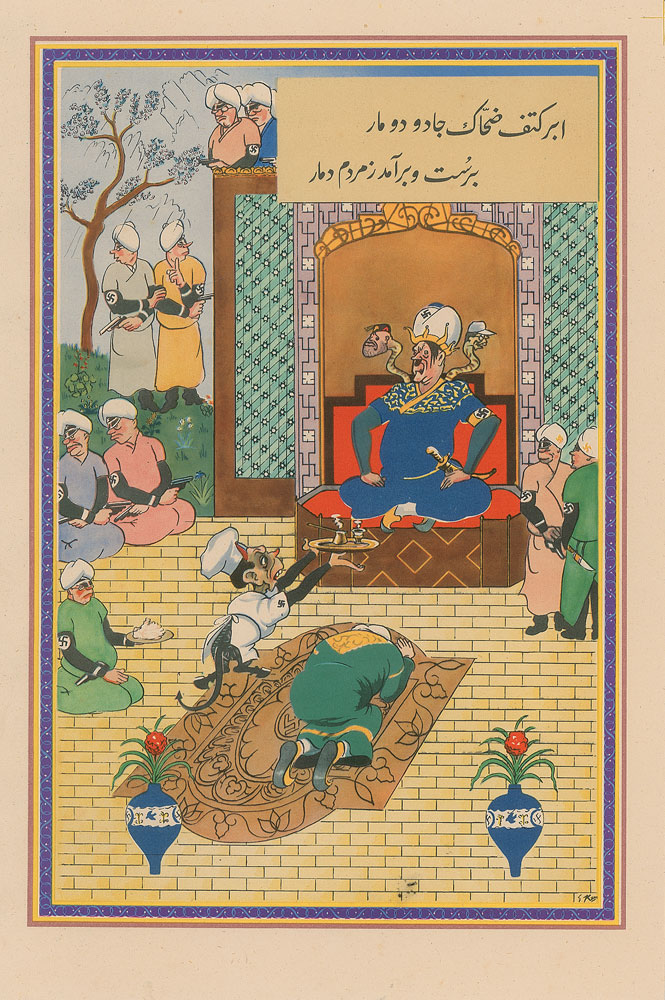 Collection of five color 1943 World War II propaganda posters, each measuring 13.5 x 9, done by British artist Kimon Evan Marengo for the British Ministry of Information, each with Persian/Farsi text in a square contained in the poster, and the artist’s printed initials in one corner of each poster. These five posters tell the story of Hitler, by adapting it to the five scenes from the Shahnameh of Ferdowski. Hitler is depicted as the mythical figure Zahak, an evil king who had two snakes (drawn here with the faces of Mussolini and Tojo) growing out of his shoulders. KEM prepared the posters between March and October 1942 to coincide with the Teheran Conference, held in Iran between November 28– December 2, 1943, at which he was an official observer. During the conference, Roosevelt, Churchill, and Stalin signed a Declaration on Iran that committed the three powers to Iran's independence. In fine condition, with some scattered light wrinkling and toning. Egyptian-born and Oxford-educated, KEM produced some 3000 anti-Nazi propaganda drawings for the British Ministry of Information during World War II. His fluency in European and Middle Eastern languages made his artwork especially useful for wartime distribution in Algeria, Morocco, Egypt, and Iran, where fear of German influence had prompted British and Russian occupation of the oil-rich country. RR Auction COA.
