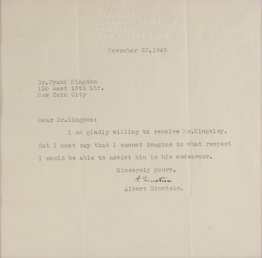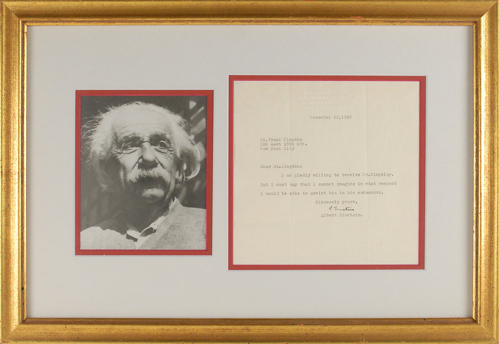 TLS signed “A. Einstein,” one page, 7 x 7, blind-stamped personal letterhead, November 22, 1945. Short letter to Dr. Frank Kingdon. In full: “I am gladly willing to receive Mr. Kingsley. But I must say that I cannot imagine in what respect I would be able to help him in his endeavour.” Double-matted and framed with a portrait of Einstein to an overall size of 19 x 13. In fine condition, with intersecting folds. Kingdon, the letter’s recipient, was the president of the University of Newark and an outspoken anti-Nazi detractor since 1929, and led antiwar, anti-fascist rallies at the college. In 1940, he became the first chairman of the Emergency Rescue Committee formed to aid European refugees. Two years later, Kingdon’s Emergency Rescue Committee merged with Einstein’s International Relief Association to create the International Rescue Committee. Pre-certified John Reznikoff/PSA/DNA and RR Auction COA.