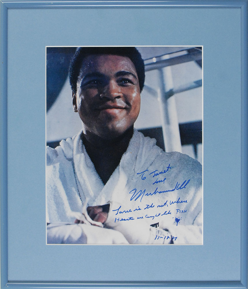 Color glossy 7.5 x 9.5 photo of Ali during training, signed and inscribed in blue felt tip, “To Janet, love Muhammad Ali, Love is the net where hearts are caught like fish, 11-18-87,” adding a small sketch of a heart. Matted and framed to an overall size of 12 x 14. In fine condition. Pre-certified Steve Grad/PSA/DNA and RR Auction COA.
