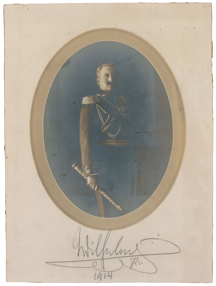 Matte-finish 6.75 x 9 photo of Wilhelm in uniform, signed below the image in pencil, “Wilhelm, 1914.” Scattered surface impressions, moderate silvering to dark areas of the image, and trimmed edges, otherwise fine condition. A remarkable photo, signed and dated in the crucial year of 1914. RR Auction COA.