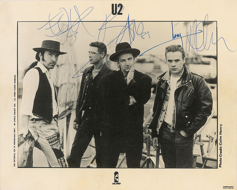 Semi-glossy 10 x 8 Island Records Joshua Tree-era publicity photo, signed in blue ballpoint, “Bono ’87,” “Edge,” and “Adam,” and in blue felt tip, “Larry.” In very good to fine condition, with scattered creases and surface marks. Pre-certified Roger Epperson/REAL and RR Auction COA.