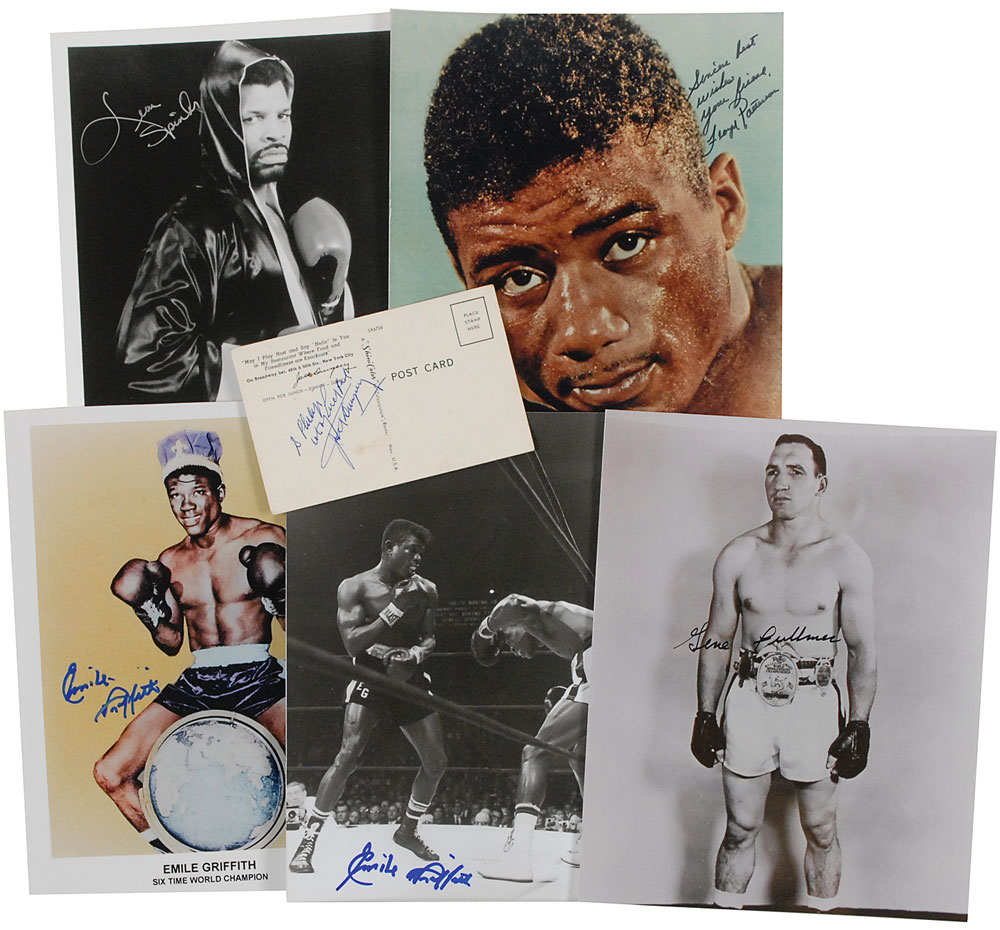 Collection of five 8 x 10 photos and one postcard, each signed by a boxer, including: Jack Dempsey (on the reverse of a postcard), Floyd Patterson, Gene Fullmer, Leon Spinks, and Emile Griffith (2). In overall fine condition. RR Auction COA.