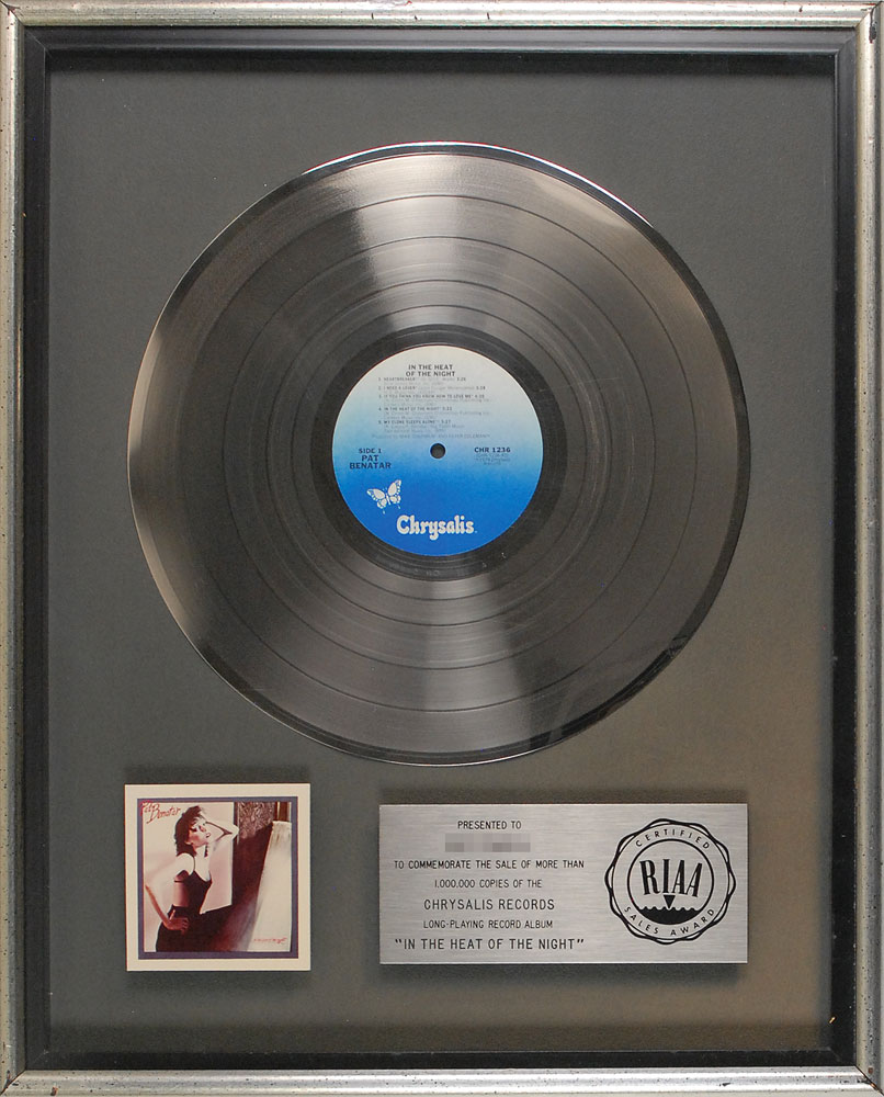 Official floater-style RIAA platinum record sales award commemorating the sale of more than 1,000,000 copies of the Chrysalis Records long-playing record album ‘In The Heat Of The Night.’ Disc is framed with its plate and a color reproduction of the album cover to an overall size of 16.75 x 21. Award retains its original backing complete with an area of toning from the missing New York Frame & Picture Co. label. In fine condition. RR Auction COA.